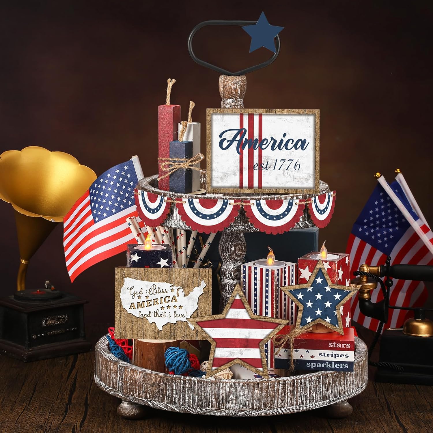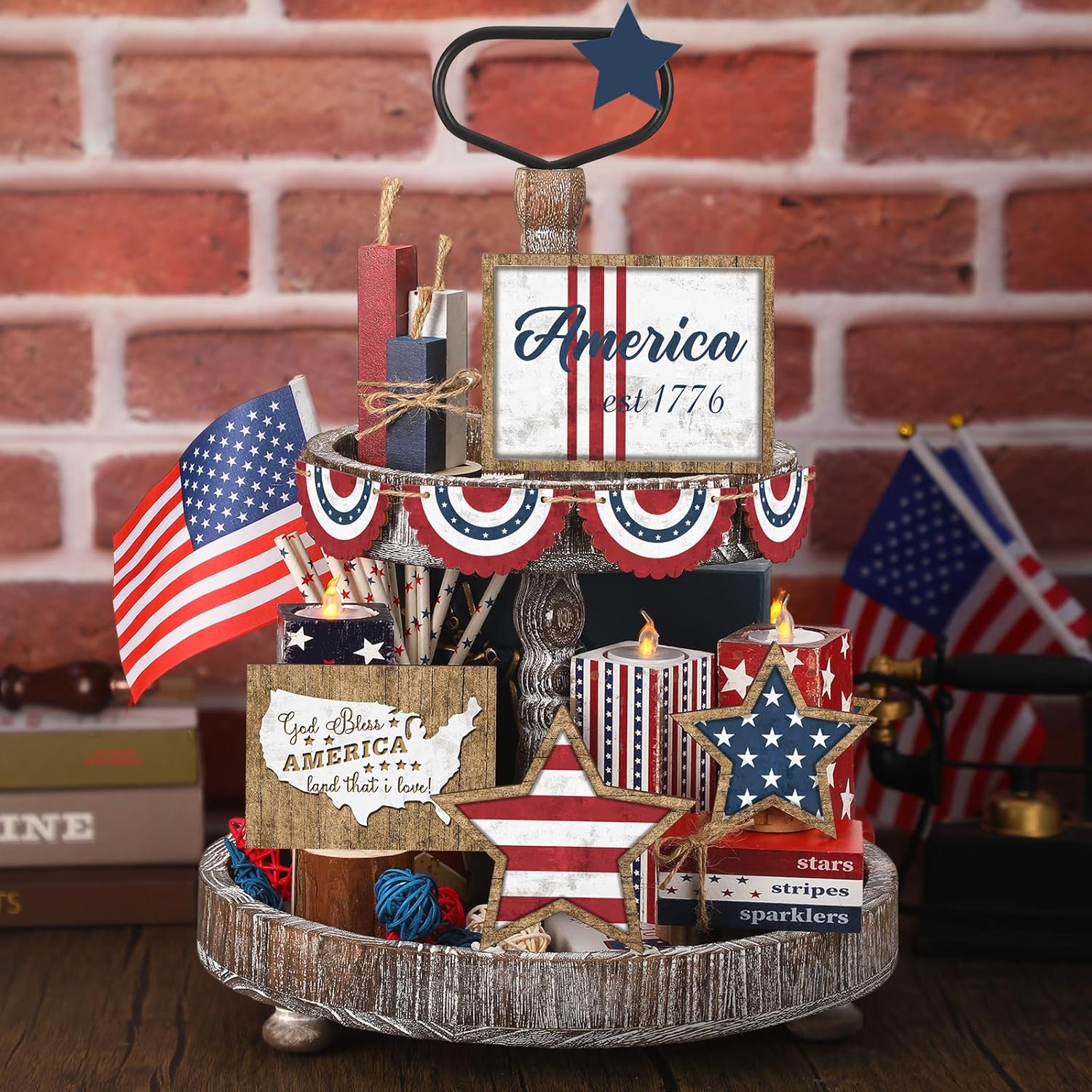 Features: Invite cheer into your home with the 4th of July tiered tray decoration set. Whether it's a together or a quiet family celebration, the Patriots' Day decor will escalate the festive spirit. So, go on, introduce this patriotic charm and watch how it enhances the Independence Day atmosphere. Versatility is at the heart of this 4th of July wooden tiered tray decor. Suitable to adorn various locations, these decor pieces give you the freedom to spread the patriotic vibe throughout your home or office. They blend in seamlessly, intensifying the festivities wherever placed. Specifications: Main material: wood Main color: red, white, blue and Size: about 6.9 inch high between top tray and bottom trayPackage includes: 15 X 4th of July patriotic tiered tray decorNotes: Manual measurement, please allow slight errors on size. The color may exist a slight difference due to different screen displays.
