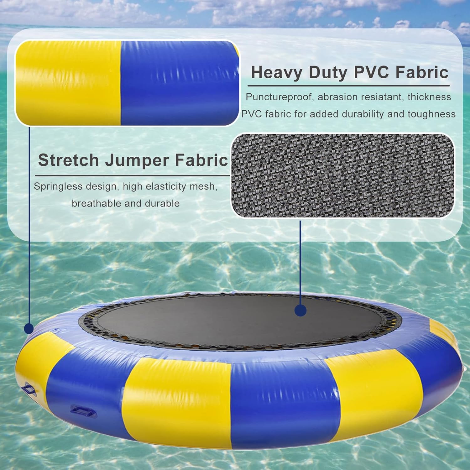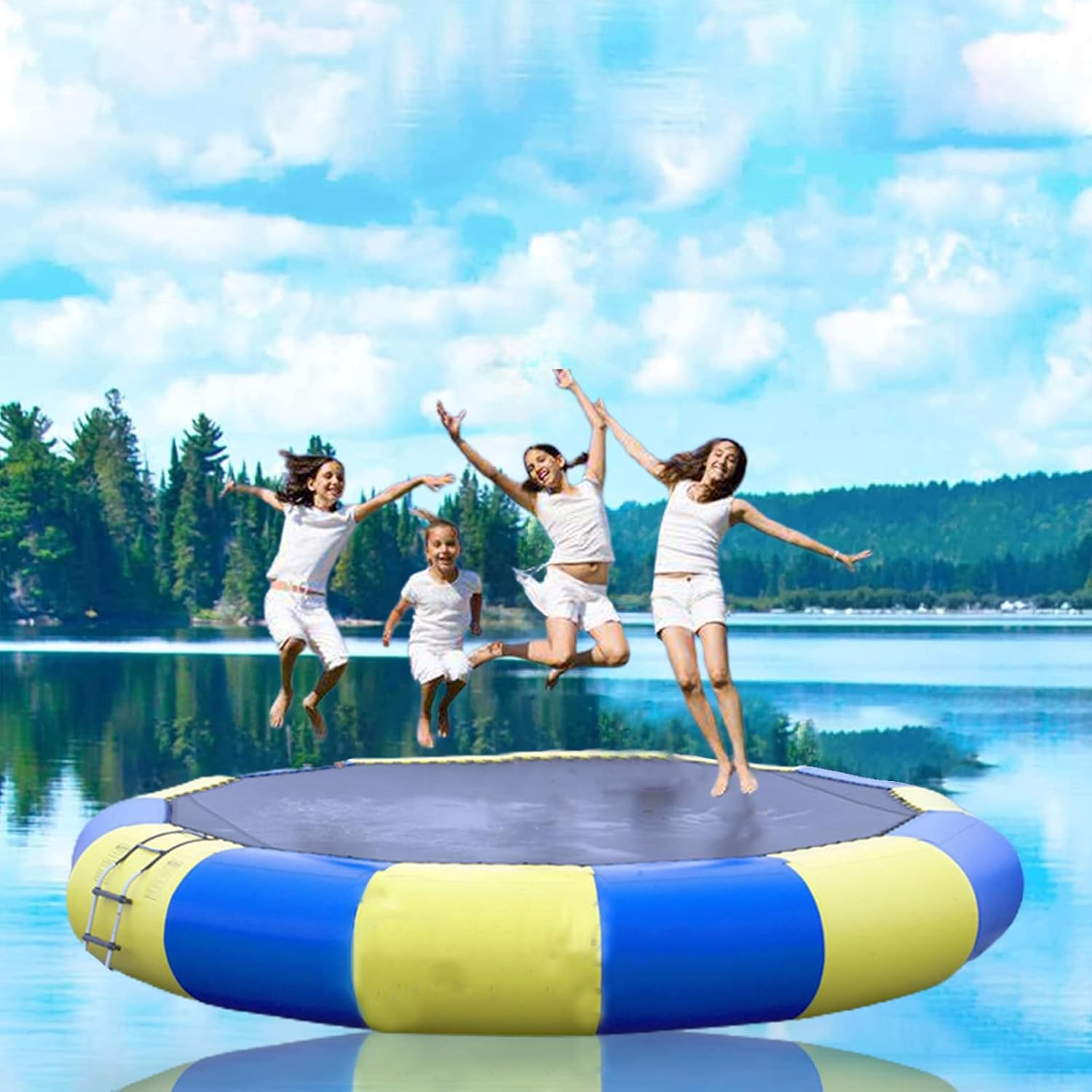 ❊Perfect water party trampoline adds even more fun to your water park.❊The inflatable water trampoline has a wide range of uses and can be used as a swimming platform, fishing platform, or sunbathing platform. ❊Specifications:Name: Inflatable water trampolineMaterial: Polyvinyl Chloride (PVC)Frame Material: PVCShape: RoundPad Type: Elastic ClothColor:Blue-yellowFrame Size: 20FTSuggested Users: Adult, Kids, Teenagers❊Package Included:1* Floating water trampoline1* Electric air pumps1* Rope ladder❊Note: 1.Only use the water trampoline if you are sure there are no air leaks.2.Please take off your shoes and don't take anything sharp while playing.3. Please be aware that kids must be supervised by adults when playing.4. Please allow for slight color difference due to shooting light and 1-3CM error due to manual measurement.