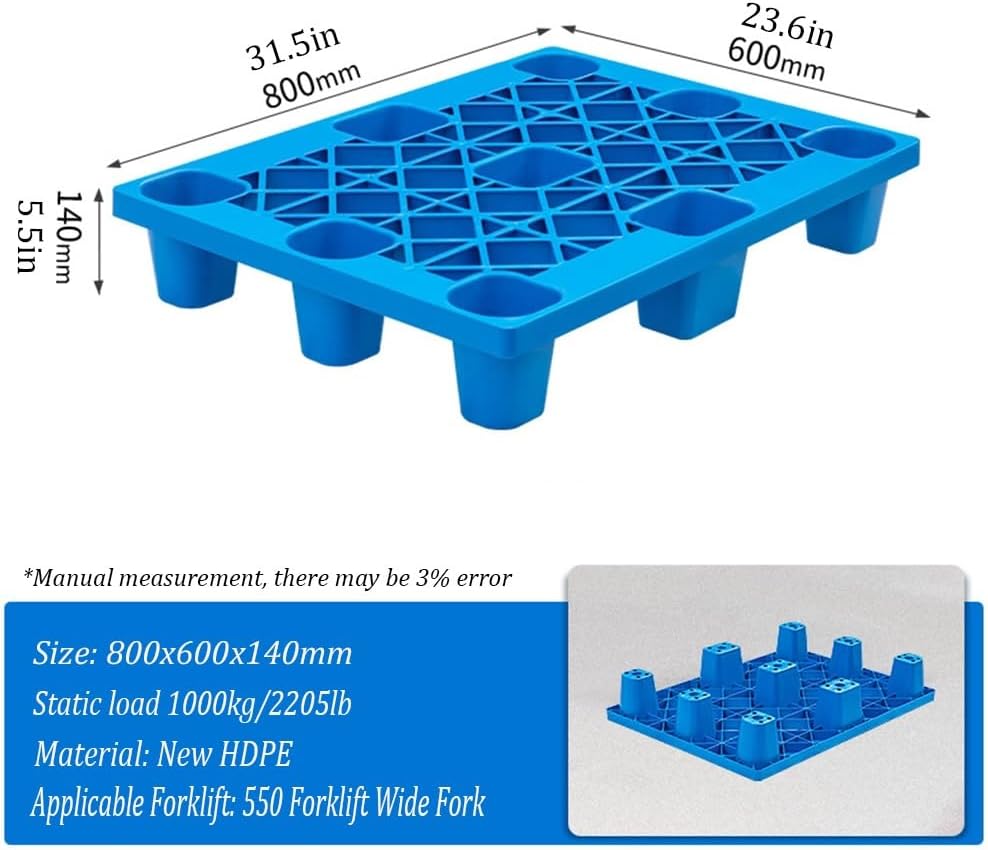 This plastic pallet set is a set of 2, and the single load-bearing capacity reaches an amazing 2204 pounds/1000kg! It is very suitable for stacking various heavy objects and can be used repeatedly for a long time. Using pallets will help keep your workspace or storage area tidy and organized, prevent damage caused by direct contact with the floor, and prevent items from getting wet.Product name: Heavy-duty plastic pallet set (4 pcs)Color: BlueMaterial: Recycled High Density PolyethyleneSize: L31.5xW23.6"xH5.5"/80x60x14cmWeight: 12kg (4pcs)Packing list:Pallet x4
