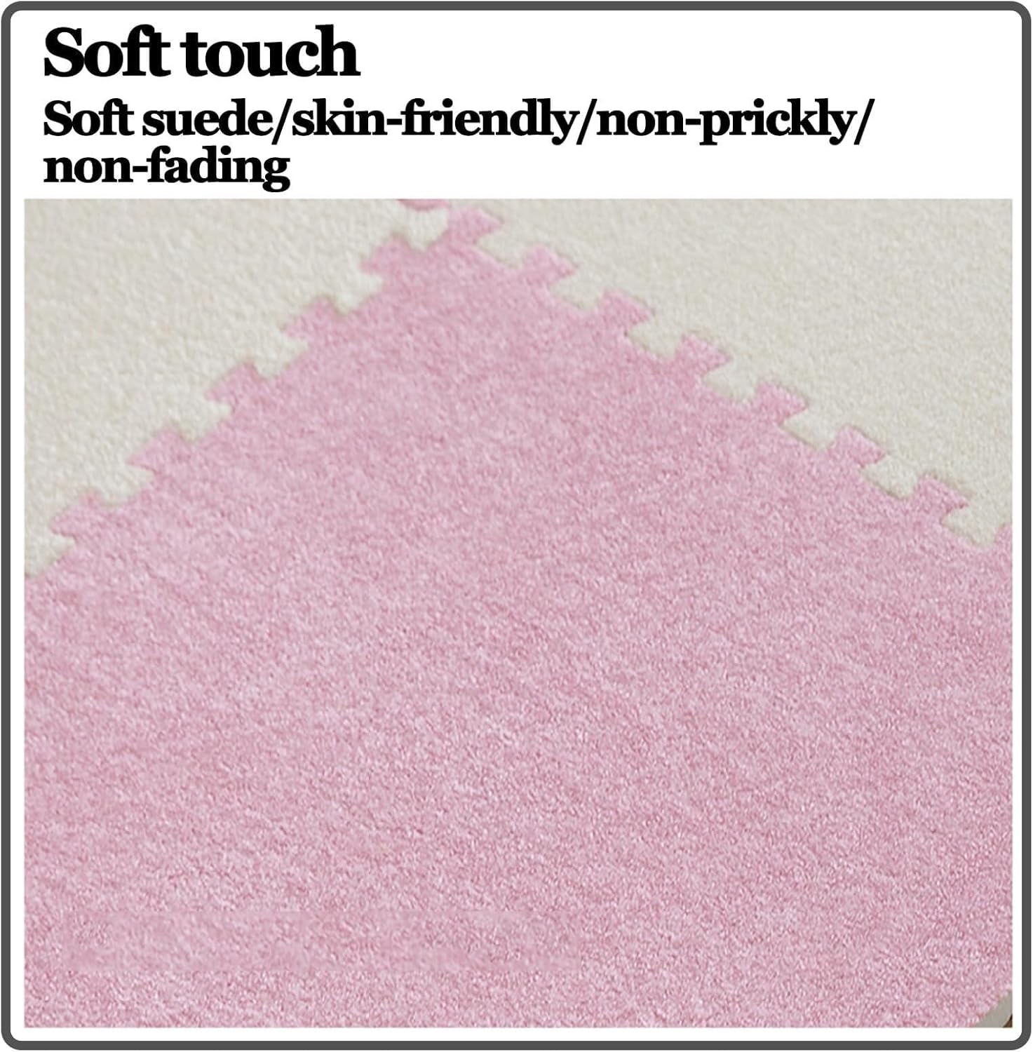 Square Soft Fluffy Tiles with Border Play Mat Protective Floor for Children Kids Room Home Parlor BedroomProduct name: EVA foam patchwork padMaterial: Velvet fabric on the surface, EVA on the bottomFeatures: can be cut, spliced, and wash-freeSpecifications: 30X30X1cm/anti-slip pattern design on the bottomApplicable scenarios: bedroom, living room, balcony, bay window, study, studio, gym, yoga room, etc.Includes:48x foam carpets