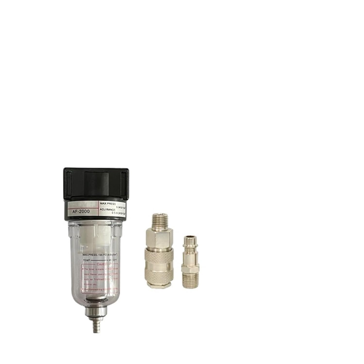 Filter, Regulator & Lubricator CombosFeatures1. Exquisite and compact structure.2. Small pressure loss and high water separation efficiency;3. Filter accuracy is 5um and 40um optional;Installation and Usage1 Before installation, please check whether the components are damaged during transportation.2. Pay attention to whether the air flow direction (note the “ ” direction) and thread type are correct.3. Please pay attention to whether the installation conditions meet the technical requirements (such as "working pressure" and "operating temperature range").4. Pay attention to the medium used or the installation environment, and avoid contact with chlorine-containing, carbon compounds, aromatic compounds, and oxidizing acid and alkali substances to avoid damage to the cup body and oil cup.5. Clean or replace the filter element regularly. The oiler and pressure regulator should be used in order from large to small.6. Pay attention to dust prevention. When disassembling and storing the device, dust covers should be installed on the air inlet and outlet.==========Type: Source Processing UnitModel:AF2000Origin: Mainland China