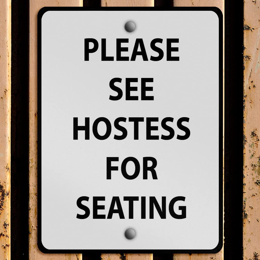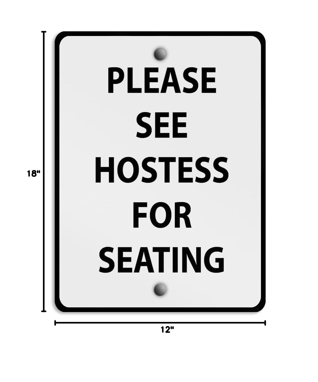 Signs Outdoor/Indoor Metal Personalized signProtect yourself and avoid accidents with our metal warning sign. Communicate instructions and safety warnings efficiently to others. The text reads: please see hostess for seating sign. Perfect for businesses looking for: Hotess metal signs, Zone cut signs, Property signs, Facility wall signs, or Location yard signs. Make sure your message or instruction catches the attention and is being seen as well as respected. Also available in different shapes and sizes, you will always find the perfect fit for you!Our designs are professionally printed with state-of-the-art equipment guaranteed to last for years. We have more than 12 years of experience in the printing industry to offer you stunning detail and rich lifelike colors. All prints are carefully made in our lab in Tampa, Florida.BEST METAL SIGN ON THE MARKET!** Made from high quality aluminum** Perfect for indoor & outdoor** Treated against UV and water to last for year** pre-drilled holes for an easy installation** Rounded corners made for safe handling, longer life and a professional appearance.** Design professionally printedWhether you are a business owner or a homeowner, you will be 100% satisfied with our metal signs.