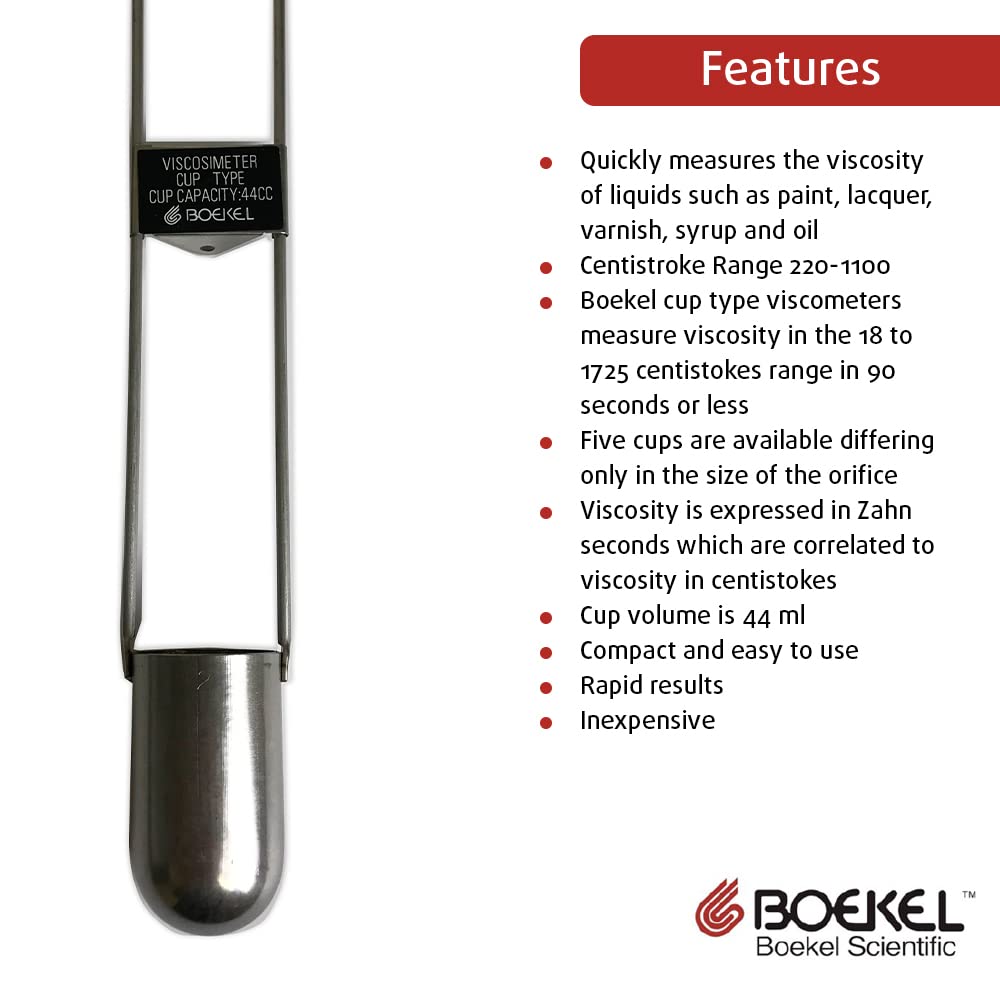 This Zahn Cup Viscometer is ideal for quick, accurate measurement of the viscosity of liquids such as paint, lacquer, varnish, syrup, and oil. Cup is bullet-shaped, corrosive-resistant plated steel, with 44mL capacity. A 30.5cm (12") suspension handle holds cup for dipping into liquids to be tested. Handle includes support for dial thermometer. Supplied without thermometer or stopwatch.