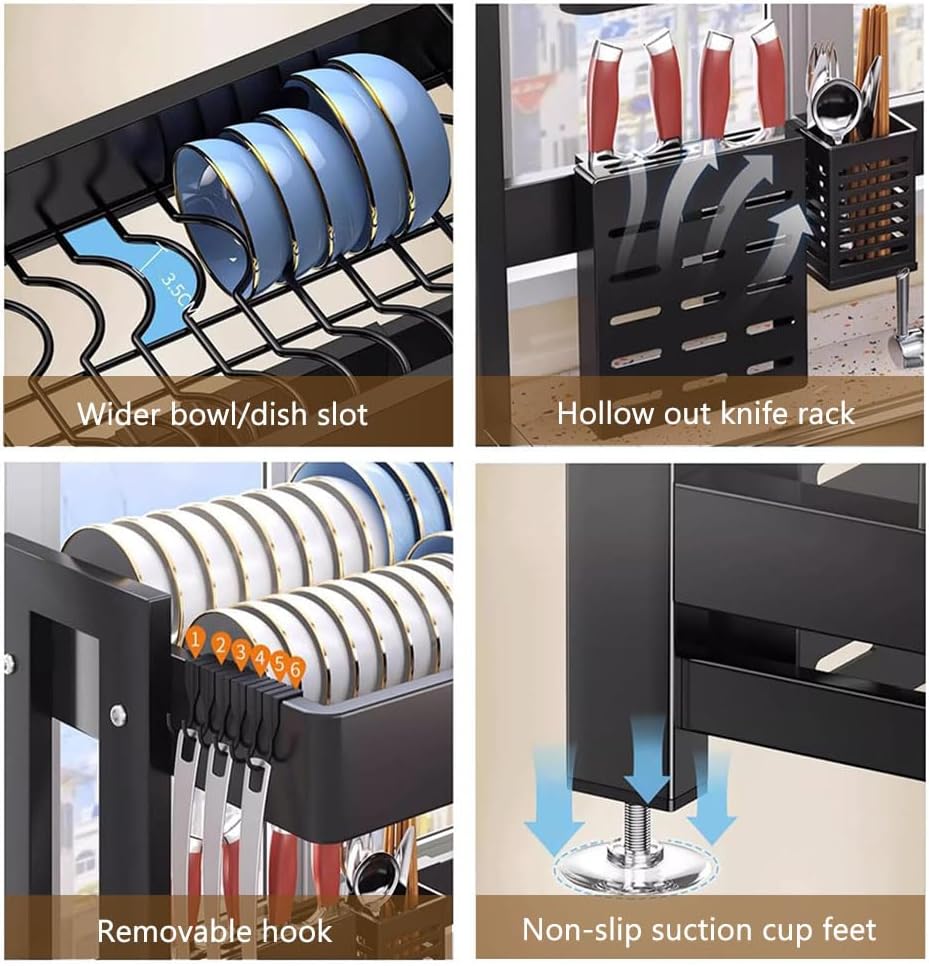 This versatile and adjustable over-the-sink dish drying rack is designed to optimize your kitchen space while providing efficient storage for all your dishware and utensils. Its compact design saves valuable countertop space, making your kitchen look clean and tidy. Transform your kitchen into a well-organized and functional space with our over-the-sink dish drying rack. Order now and enjoy a healthier and tidier kitchen experience! Specification: Product Name: Expandable dish drainer Material: Stainless steel Size: 2 layers: 64-100x28x54cm/ 25.2-39.4x11x21.3inch 3 layers: 64-100x28x84cm/ 25.2-39.4x11x33inch Special Feature: Slip resistant, Large capacity, Expandable, Automatic drainage Package includes: Main frame *1 Utensil Holder *1 Knife Holder *1 Cleaning Basket *1 Cutting-Board Holder *1 Hooks*6 Instructions x 1 Note: Due to the different monitor effect, the actual color of the item might be slightly different from the color showed on the pictures. Thank you! Please allow 1-2cm measuring deviation due to manual measurement.