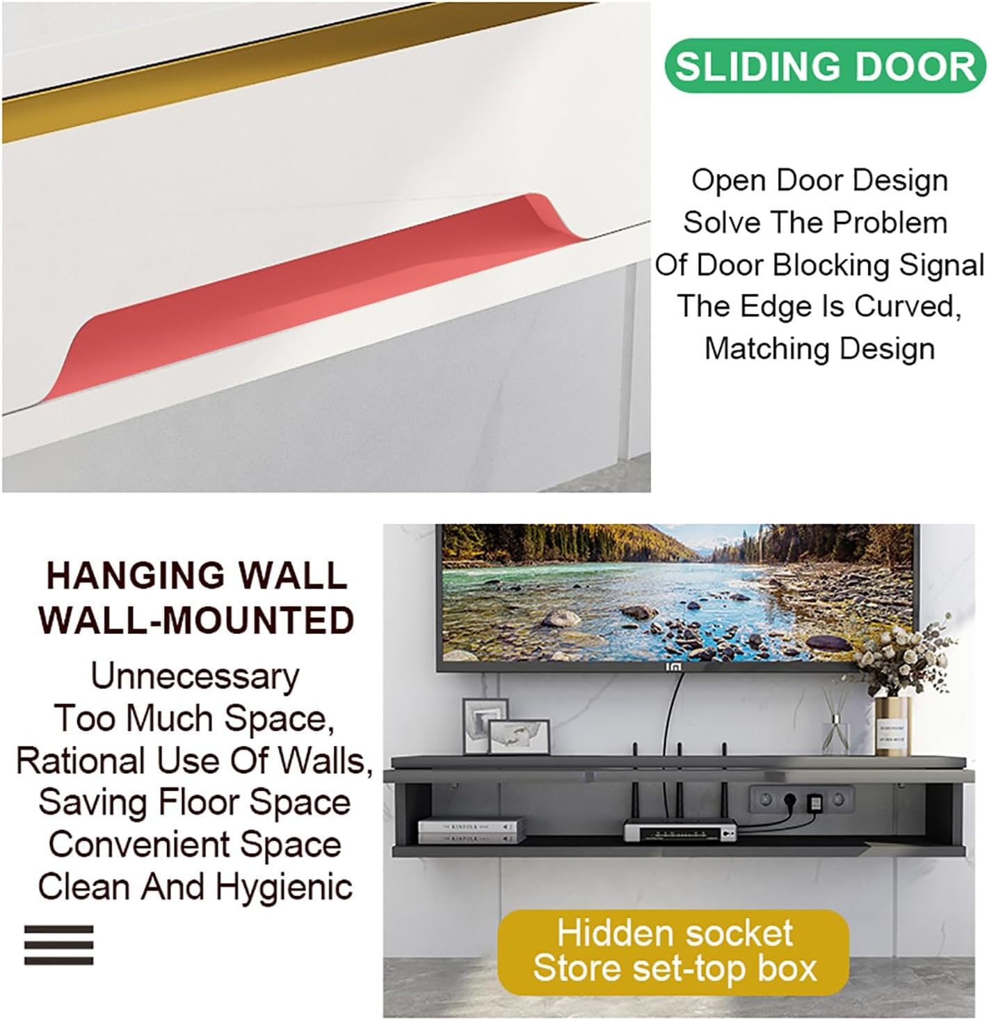 Floating TV Stand Wall Mounted High Glossy Wall Mounted TV Cabinet Modern Floating TV Cabinet Console Shelf with Upper Flap Door Storage Cabinets Media Console Crafted with a high glossy finish, this Wall Mounted TV Cabinet brings a sleek, modern aesthetic to any room. Its innovative design not only elevates your television off the floor, creating an open and spacious feel, but also serves as a striking centerpiece in your living room or bedroom.The Modern Floating TV Cabinet Console Shelf with Upper Flap Door offers ample storage solutions to keep your media devices organized. With multiple compartments, it’s perfect for housing gaming consoles, DVD players, and other electronics, ensuring everything you need is at your fingertips. The upper flap door adds a stylish touch while allowing easy access to your items, making it a practical choice for those who appreciate both form and function.Designed with convenience in mind, this Storage Cabinets Media Console features a built-in cable hole that allows for effective cable management. Say goodbye to tangled wires and messy setups—this feature ensures your cords are neatly organized, enhancing your viewing experience without distractions.Whether you're binge-watching your favorite shows or hosting movie nights, our Floating TV Stand provides the perfect combination of style and utility. Easy to install, it comes with all necessary hardware and clear instructions, allowing you to set it up effortlessly.Material: Particle boardPanel: High Gloss PanelsCreate a romantic and warm lighting atmosphere for videos, games and partiesPackage includes1 x TV standNOTE:1. Only sell storage rack, other products are shooting props.2. Due to the influence of the monitor and light, the actual color of the product may be slightly different from the color shown in the figure. Thank you!3. Due to manual measurement, please allow a measurement deviation of 1-2cm