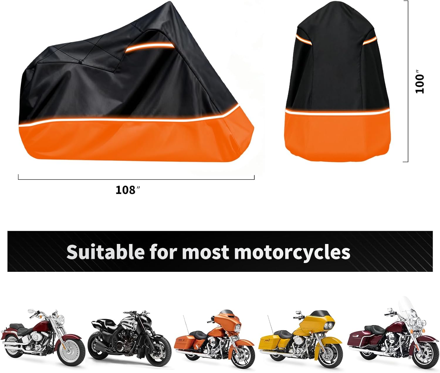 | Coverage | Full Enclosed Motorcycle Cover, Fits Motorcycles Length up to 108" x 45" x 59" |