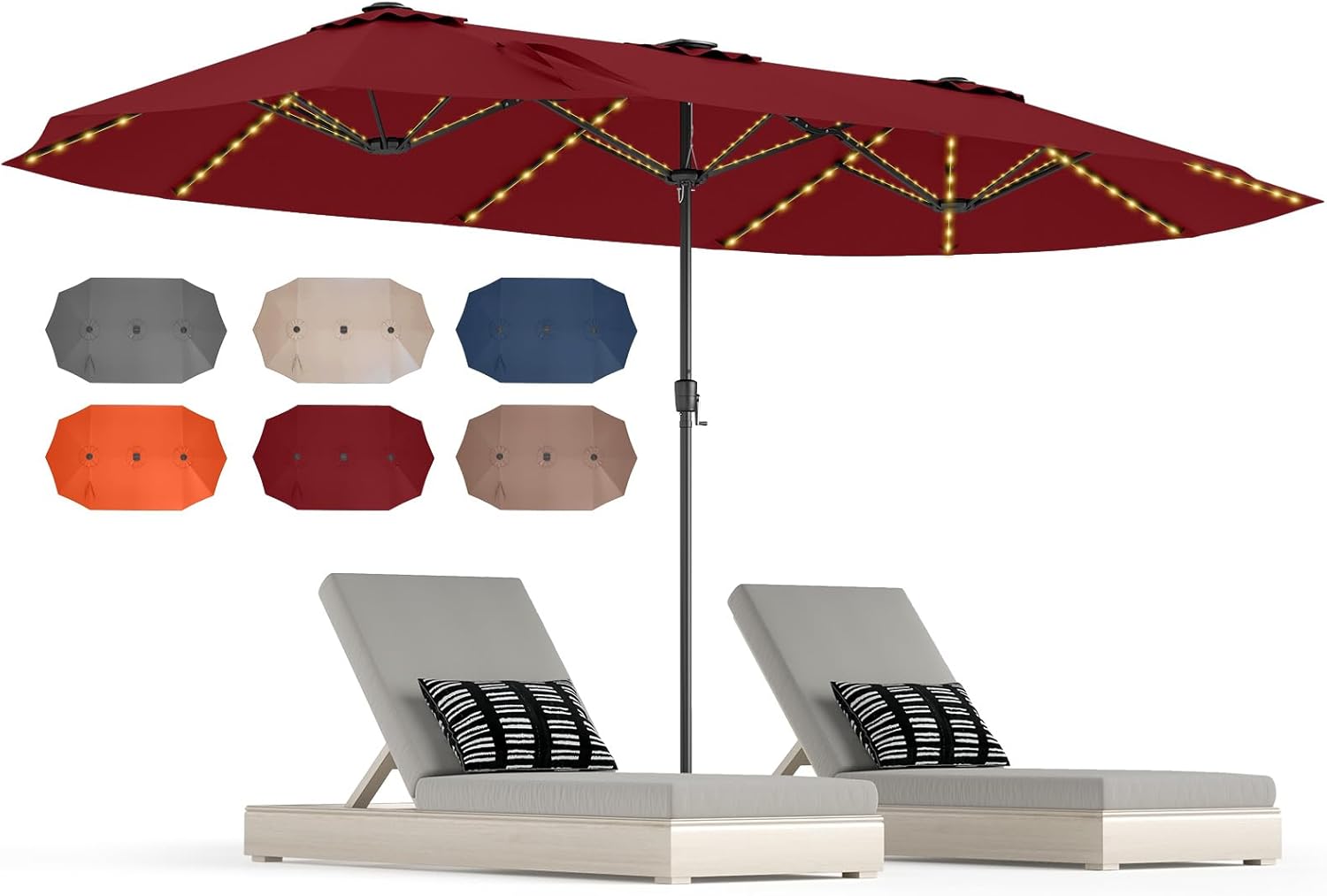 Description:Create a instant shaded oasis with the twin size patio umbrella.The double-side patio umbrella is designed to provide extensive shading coverage, making it perfect for a wide range of settings, such as backyard, poolside, deck. The 108 warm white LED lights are powered by a solar panel, which is perfect for entertaining day and night. Crafted with a high-quality polyester canopy and supported by 5+2+5 sturdy metal umbrella ribs, the extra large outdoor umbrella ensures effective sun protection and long-lasting performance. Moreover, the 2 air vents promote airflow for a cool experience and improved stability. Additionally, the 15.5 ft garden umbrella features a convenient 2-section design and a user-friendly crank handle, making assembly and opening a breeze. Also, the fixing tie allows for compact storage when not in use.Features:Double-sided patio umbrella offers extended shading areaEquipped with a solar panel for energy-saving illumination108 warm white LED lights offer 6 hours of illumination after a full chargePremium polyester fabric is wear-resistant and sun-proofOpen and close in no time with handy crank system5+5+2 sturdy umbrella ribs offer reliable stability to reduce shaking1.9"/48 mm heavy-duty central pole is sturdy and not easy to crack2 air vents help regulate temperature and increase stabilityProtective rib pockets securely keep the ribs in placeEasy to connect the 2-section poles with spring buttonPlease use a weighted stand(not included) to secure the double-sided umbrellaAssembly neededSpecifications:Color: Beige/Coffee/Grey/Navy/Orange/RedMaterial: Polyester Fabric, MetalDimensions: 15.5 x 9 x 8 ft/466 x 277 x 240 cm (L x W x H)Ground Clearance: 6.5 ft/196 cmNet Weight: 30 lbs/13.5 kgFeatures:1 x Double-Sided Patio Umbrella1 x User’s Manual