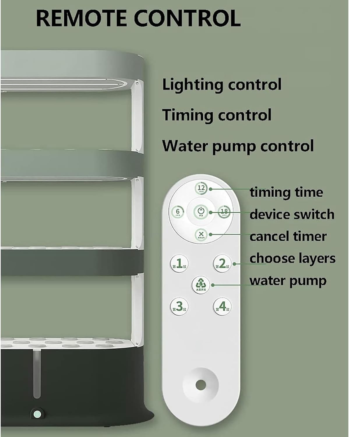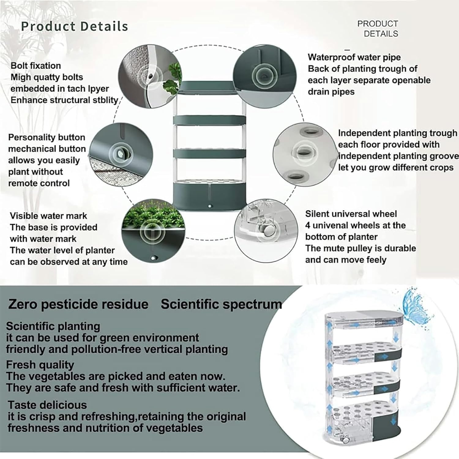 Hierarchical control The four-layer planting layer can be split arbitrarily, the height of the machine is control by you, the water level and lighting can be control by layers, and the timing can be set independent cultivation The lower three layers of hydroponic crops, each layer has an independent planting tank, the layers are different, each layer can grow different crops, and the uermost space can be soil or hydroponic visible water level There is a water level line at the base of the machine, so you can observe the water level of the planter at any time Silent universal wheel 4 universal wheels on the bottom of the planter, the mute pulley is durable and can move freely Specifications Product Name: Hydroponic Tower Product material: +glass fiber Power consumption: 90W Network requirements: no network required Control method: remote control Number of tubes: 9 Lighting category: full spectrum Product size: 1045*685*385mm Product weight: 10kg Package Include 1 x Hydroponic Tower Kit