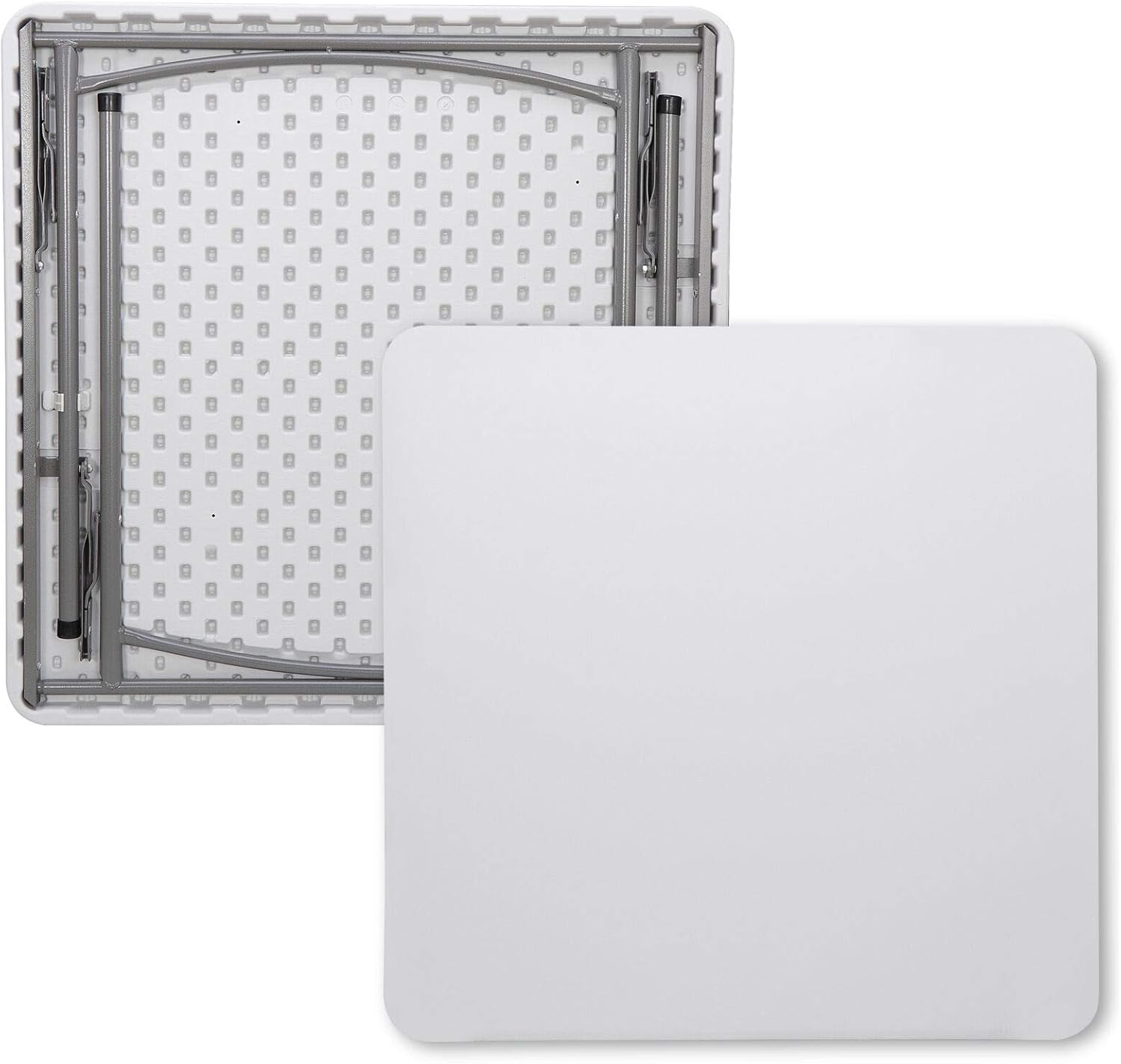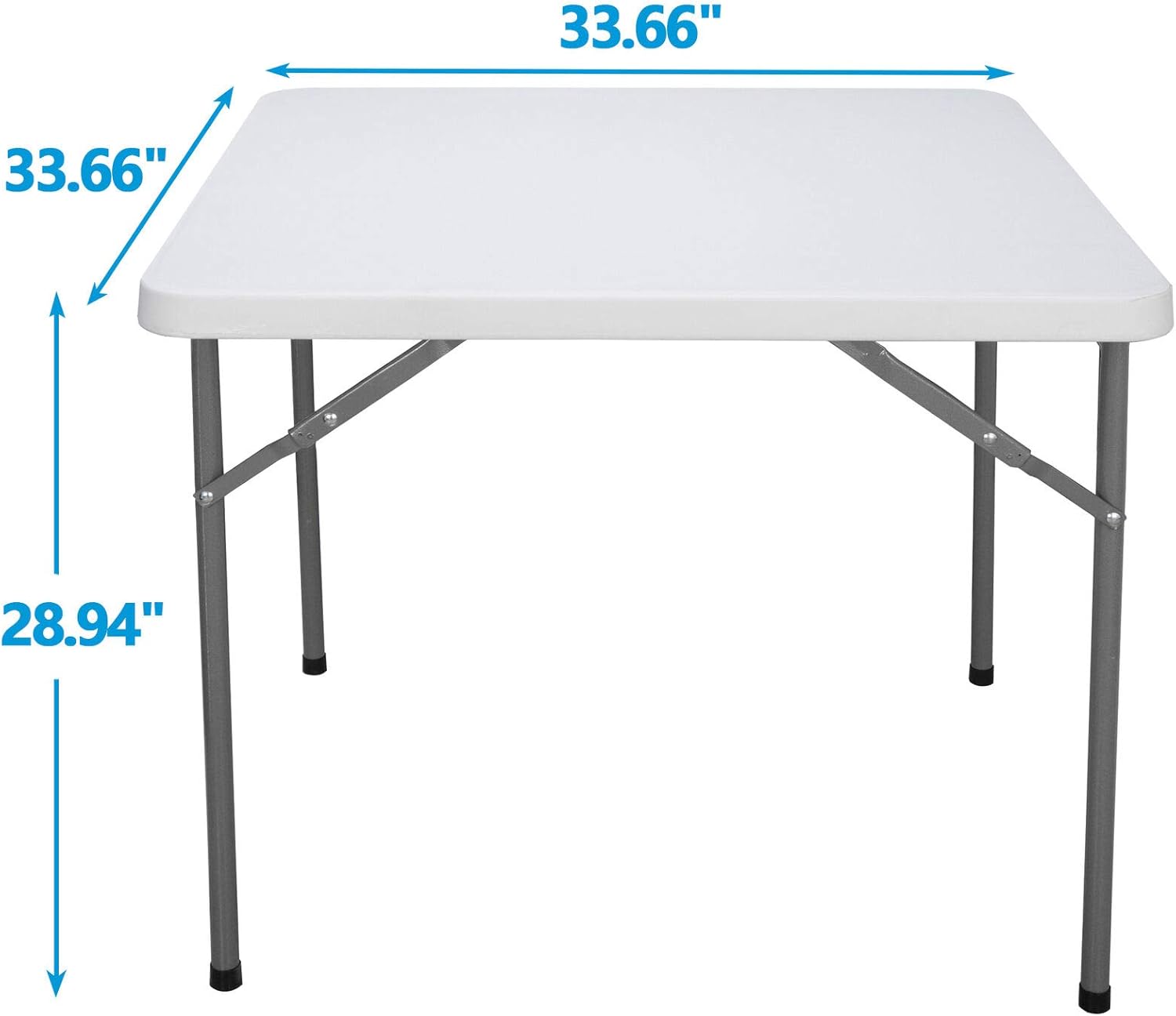 Heavy-duty blow-mold light grey resin top for durability and easy cleanup.Resin surface is waterproof, scratch, and impact resistant, making this multipurpose utility table ideal for indoor or outdoor use.Light grey powder-coated steel tube framing provides strong long-lasting use and lightweight portability.Versatile surface option for parties, family reunions, trade shows, business meetings, reception areas, training rooms and banquet venues. Color:WhiteItem Weight:19.73lbsProduct Size:33.66"*33.66"*28.94"Product material: Panel Material is HDPEThe Metal Part Is Q195 Stainless Steel Sprayed