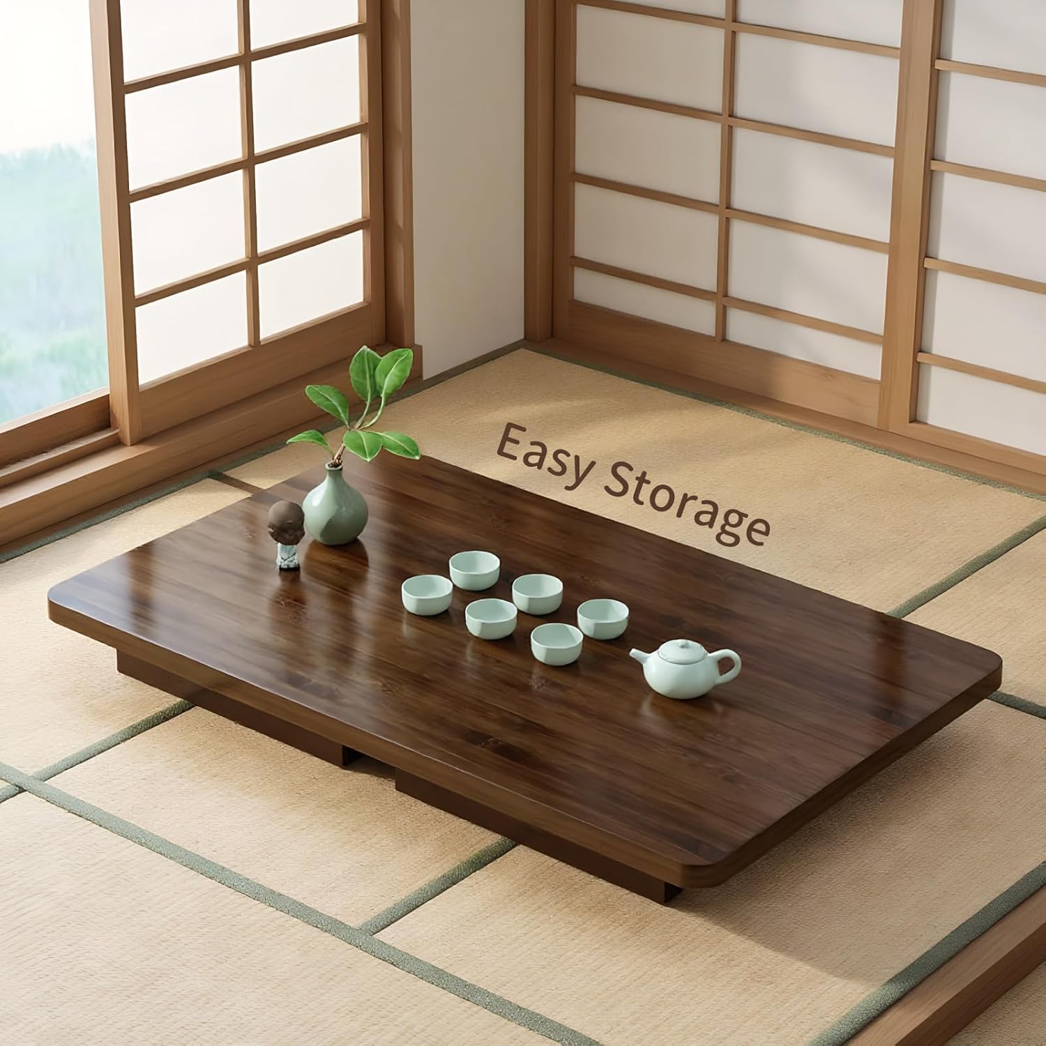 This versatile Japanese floor table combines minimalist design with exceptional functionality, creating the perfect solution for modern living spaces. Crafted from sustainable bamboo, this folding coffee table is built to be both an elegant centerpiece and a practical, space-saving piece of furniture. The table features a durable, low-maintenance tabletop that is engineered for daily use. Its surface is waterproof, heat-resistant, and scratch-resistant, allowing you to safely place laptops, hot mugs, or dinner plates without worry. Spills can be wiped clean in seconds with a damp cloth. The structure is designed for stability and strength, with thickened legs and a stabilizing crossbar that provides a reliable load-bearing capacity, ensuring it remains sturdy during use. A key feature of this table is its innovative folding mechanism. When not in use, it folds down to a slim profile of just a few inches thick, making it effortless to store behind a sofa, under a bed, or in a closet. This makes it an ideal piece for small apartments, dorm rooms, or any area where maximizing space is a priority. The table requires no assembly—simply unfold the legs to set it up in seconds. The design is both modern and timeless. It retains the natural wood grain, offering a touch of warmth and organic beauty that complements a variety of décor styles, from contemporary living rooms to traditional tatami rooms. Its clean lines and classic silhouette allow it to blend seamlessly as a low coffee table, tea table, or floor desk. Its applications are vast. Use it as a kotatsu table (with a compatible heater), a low table for sitting on the floor during meals, a laptop desk for remote work, a tea table for living room gatherings, a meditation station, or even as a portable surface for outdoor picnics. It is equally suitable as a low desk in a bedroom, a children's activity table, or a floor dining table for casual meals. Offering the convenience of a collapsible coffee table and the aesthetic appeal of authentic Japanese furniture, this foldable floor table is a thoughtful gift for new homeowners, students, or anyone who values adaptable, multi-functional design.
