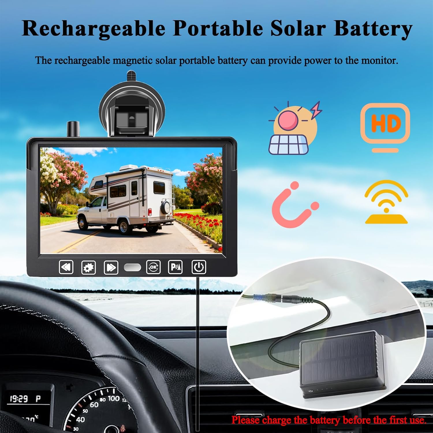 | BuiltIn Media | 5 Inch 1080P Monitor, Cigarette lighter, Magnetic Wireless Backup Camera×1, Power Cable, Solar Panel Power Bank for Monitor |