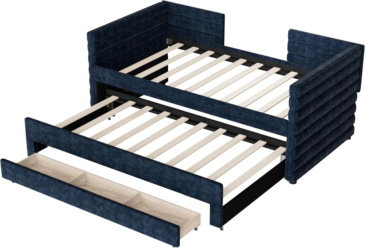Merax Twin Size Sofa Bed with Trundle and 3 Storage Drawers, Linen Fabric Upholstered Daybed Frame for Guest Room, Living Room, Space-Saving, No Box Spring Needed (Dark Blue)