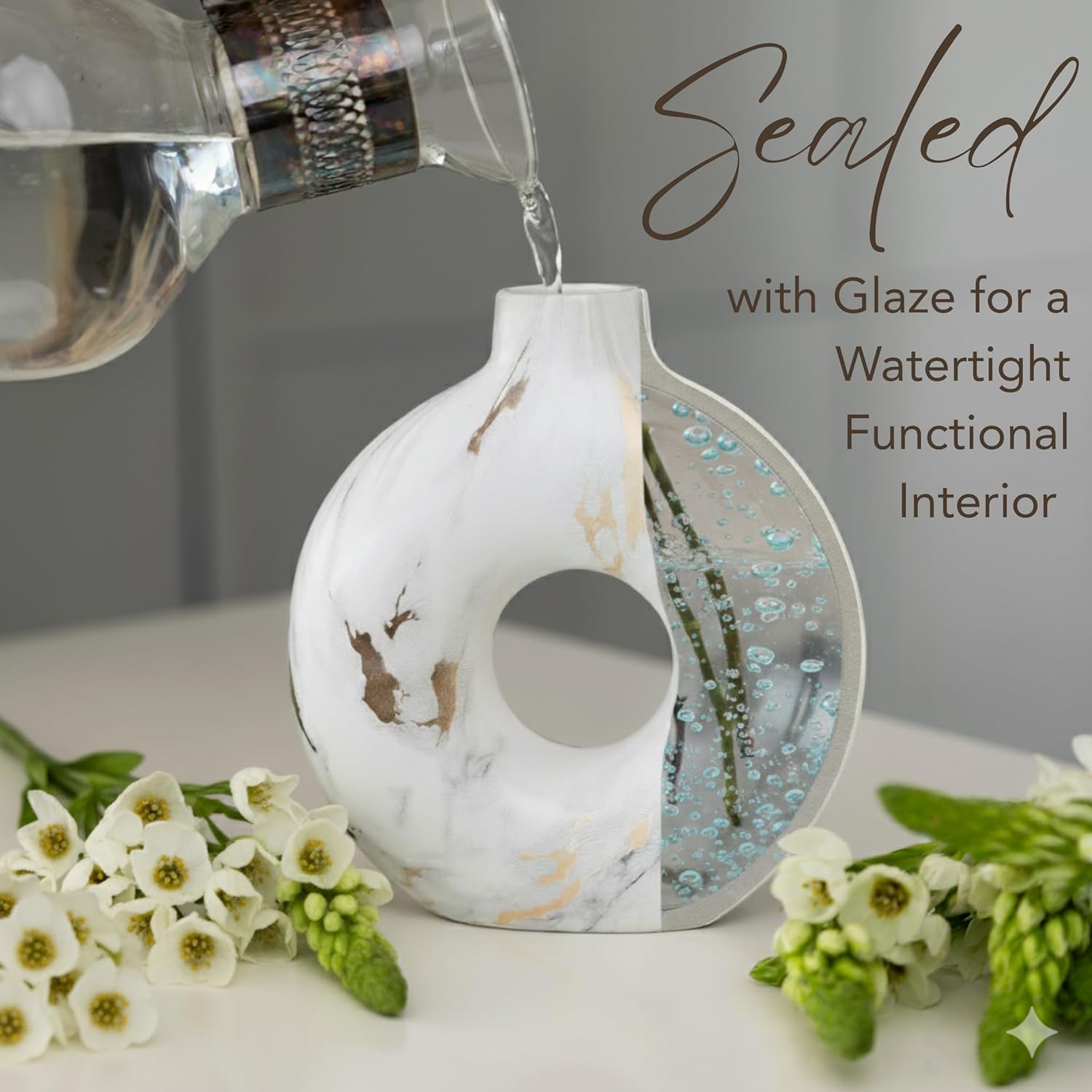 | Material Type | Ceramic, Ceramic material retains heat, making it suitable for warm floral arrangements, Crafted from high-quality ceramic for lasting durability and timeless appeal, Each vase is made from heavy-duty ceramic, ensuring stability and sturdiness, Marble, Premium ceramic composition resists fading, ensuring vibrant decor year-round, Smooth ceramic finish enhances elegance and makes cleaning a breeze, The non-porous ceramic surface prevents water damage and staining, Versatile ceramic design complements various decor styles, from boho to contemporary |