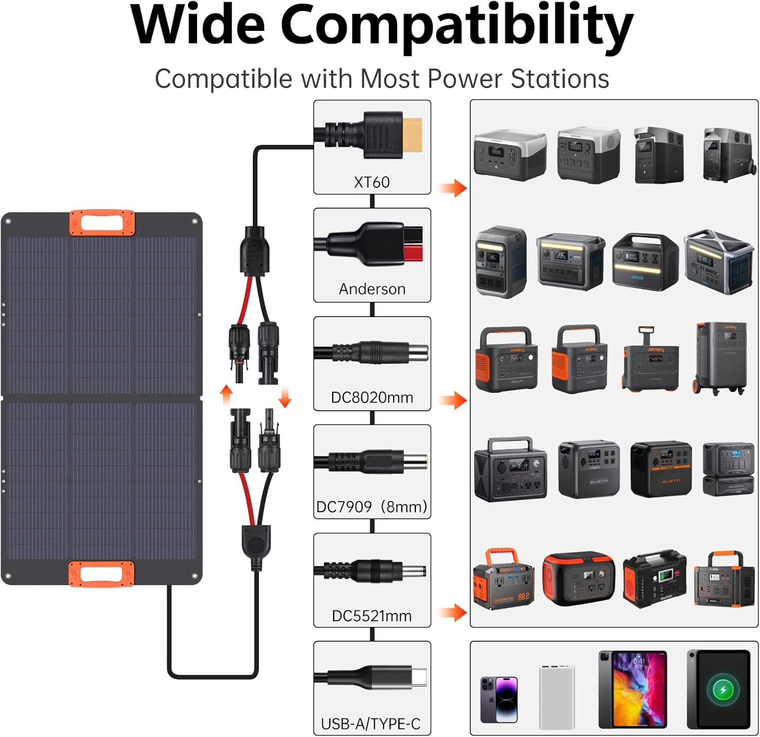 | Included Components | 1x100W Foldable Solar Panel, 1x2 Meter MC4 Connector- DC5521,Anderson,XT60,DC7909(8mm), 1x9 Adapters+DC8020mm, 1xUser’s Guide |