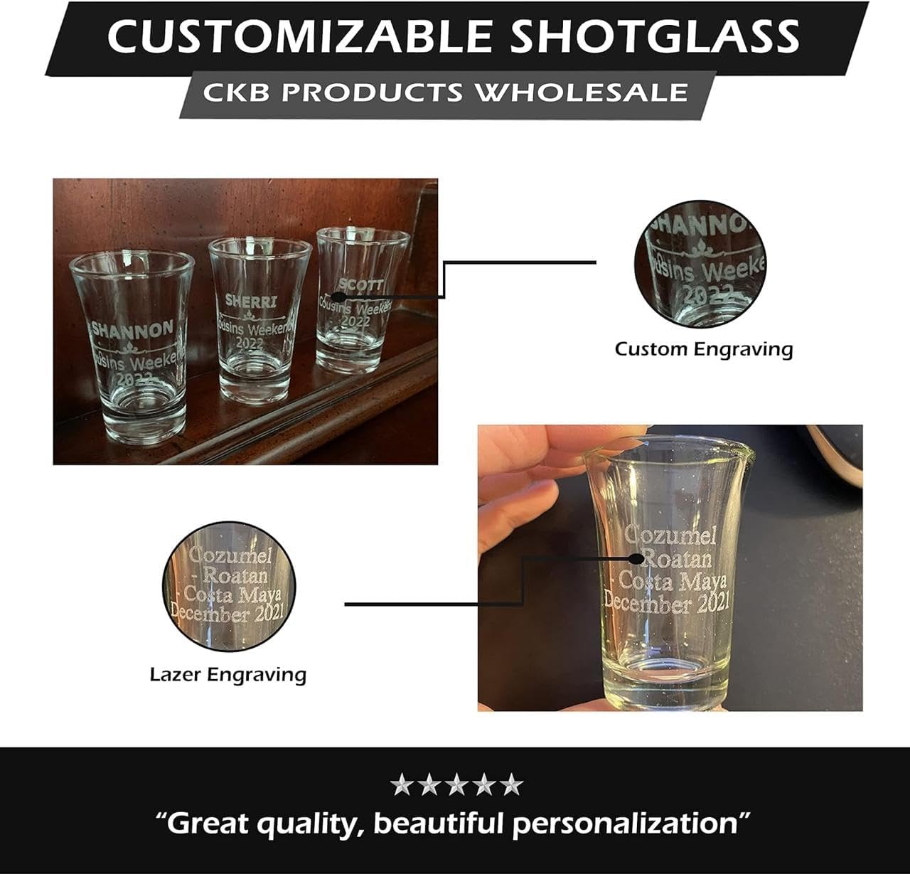 Make a toast and cheers to all the special celebrations and shared memories you'll create with our Personalized Laser-Etched Engraving Shot Glasses. These one-of-a-kind whiskey shot glasses have charm and a lighthearted appeal and are customizable, allowing you to place your text, monogram, or image and etch it onto each glass. Delight all of your guests while making that special toast with these fun shot glasses. Gift this personalized shot glass to that special couple, loved one, or friend for a birthday, bridal shower, college graduation, retirement, or any unique engagement. At CKB Products, we are a leading supplier of steel drinking flasks manufactured and leak-tested to the highest quality standards. We offer an array of distinguished, classic, regular, and customizable flasks, including quality drinkware, and we take pride in creating premium products and providing you with an easy, fast, and exciting shopping experience.