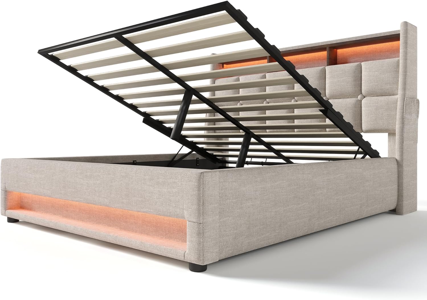 Modern Functionality Meets Vintage StyleThis Queen Size Upholstered Platform Bed is a perfect fusion of comfort, convenience, and character. Featuring a vintage-inspired wood grain frame with soft cotton-linen upholstery, it adds warmth and texture to any bedroom. High-density foam padding on the headboard ensures a cozy and supportive backrest for reading or relaxing.Customizable LED Lighting with Remote ControlLED strips on both the headboard and footboard add a modern glow to your sleep space. Adjust brightness and switch between colors using the included remote—ideal for setting a cozy nighttime ambiance or a vibrant vibe for movie nights.USB Charging Built InKeep your devices powered at your fingertips. A built-in USB charging port on the headboard allows you to conveniently charge your phone or tablet while you rest or read in bed—no more reaching for wall sockets.Hydraulic Storage & Smart OrganizationLift the mattress base with ease to reveal a spacious underbed storage compartment—perfect for storing blankets, pillows, or off-season clothing. The headboard also features open shelves for everyday items and a side pocket for remotes, books, or tablets.Durable Structure with Elegant FinishingCrafted with a sturdy metal and wood frame, this platform bed provides excellent stability and long-lasting support. No box spring needed. Its natural finish and clean-lined silhouette make it a timeless centerpiece for modern or transitional bedrooms.Note: This item ships in two separate boxes and may arrive at different times. If you receive only one box or notice missing parts, please contact customer service promptly.Main Color: Natural Main Material: Metal & Wood Bed Size: QueenProduct Dimensions: Assembled Length (in.): 85.80 Assembled Width (in.): 62.40 Assembled Height (in.): 45.70 Product Weight (lbs.): 125.66Package Size: Sub-item 1: WF316910AAB — 81.89 x 12.2 x 6.3 in. / 63.93 lbs. Sub-item 2: WF316909AAB — 63.58 x 19.29 x 5.31 in. / 61.73 lbs.