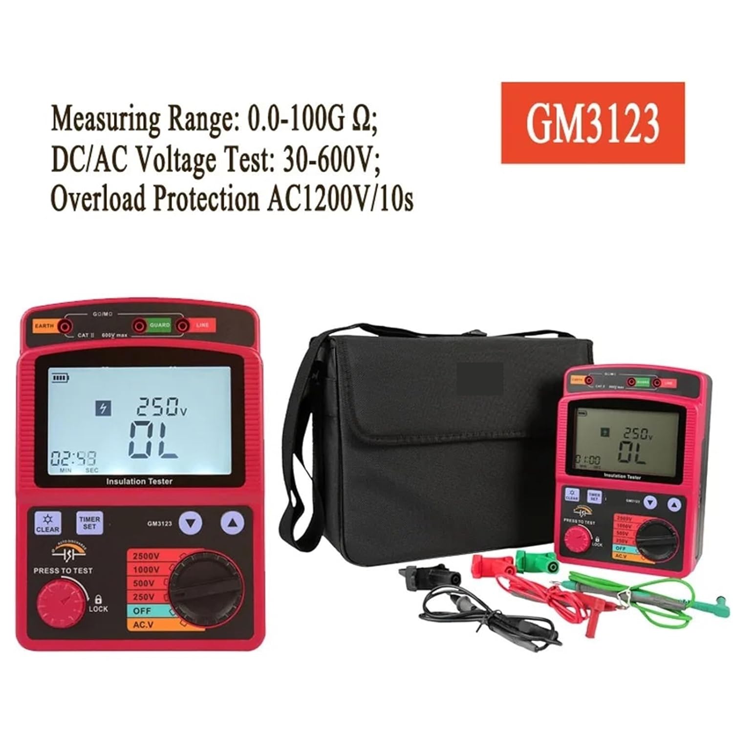 Budget: Model-GM3125 Rated voltage: 500V / 1000V / 2500V / 5000V Test range: 500V: 0.0~999M; 1000V: 0.0~1.99G; 2500V: 0.0~99.9G; 5000V: 0.0~1000G Accuracy: ±5% reading ±5% digit DC/CA Testing: 30~600V Resolution: 1.0V Overload Protection: AC 1200V/10 Withstand voltage: AC8320V/5 seconds Insulation Resistance: 1000M/DC1000V Short Circuit Current: 1.4mA Operating Voltage: 12V Power supply: 8*1.5V LR14 battery (package not included)