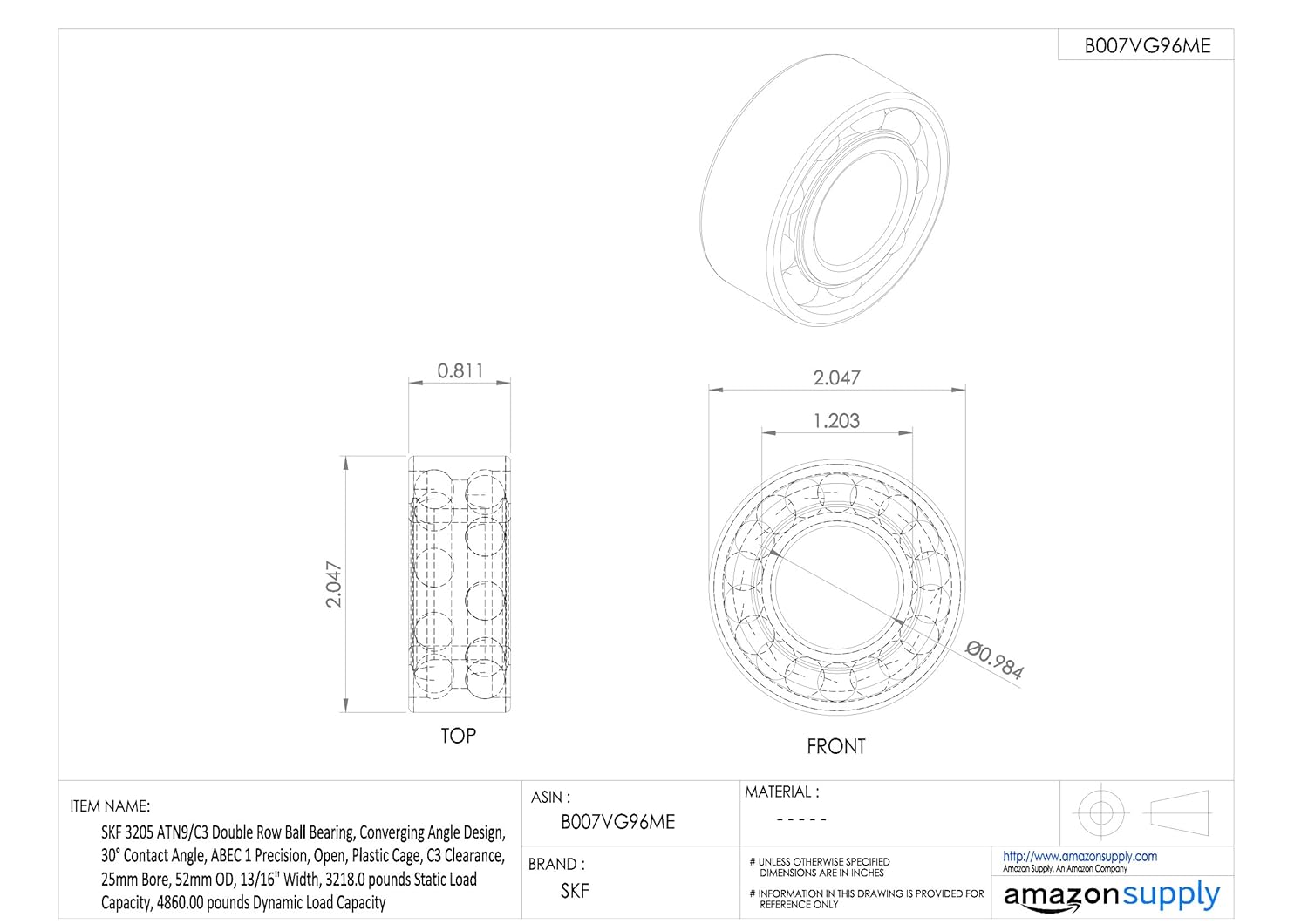 This SKF 32 A series double-row angular contact ball bearing is an open bearing, and has a 30-degree contact angle, reinforced polyamide cage, and C3 clearance rating. It supports radial loads, thrust loads in both directions, and combined loads, and occupies less axial space than a pair of single-row angular contact ball bearings mounted together. Because the two rows of rolling elements are mounted back-to-back, the bearing arrangement is relatively rigid and can accommodate tilting moments. The 32 A series does not have filling slots and has a smaller cross section than the 33 A series, making it suitable for smaller spaces, lighter loads, and higher speeds. This bearing is made of low-alloy, through-hardened carbon chromium steel for durability and resistance to deformity under heavy loads. The 30-degree contact angle of the balls in relation to the raceways gives the bearing a greater capacity for supporting thrust loads over bearings with a standard contact angle of zero degrees. Its open design facilitates lubricating the bearing in place and dissipating heat. This bearing has an injection molded snap-type cage made of polyamide 66 to prevent the balls from coming into contact with each other during use, reducing friction, vibration, and noise. This cage type can be used at operating temperatures up to 120 degrees C (250 degrees F). The bearing has a C3 axial internal clearance designation to indicate that the axial slack between the inner and outer rings is greater than the standard CN (normal) clearance. It allows for thermal expansion as the bearing supports radial loads and its balls, operating in the deep raceway geometry, reduce rotational friction. Additionally, this bearing is produced to normal tolerances in accordance with International Organization for Standardization (ISO) 492:2002 standards for quality assurance. This angular contact ball bearing is for use in commercial and industrial applications including pumps and compressors, automotive drives, gearboxes, and printing machines, among others.Rolling bearings use rolling elements to maintain the separation between moving parts to reduce rotational friction and support radial and axial loads. These elements can be one of the following types: ball, cylindrical, spherical, barrel, needle, spindle, or tapered. All rolling bearings are open, shielded, or sealed. Sealed bearings are lubricated with oil or grease in the bearing factory, while open and shielded bearings are meant to be lubricated in place, with periodic reapplication of lubrication, based on use. The shield protects the working parts of the bearing from environmental debris that may be introduced and could reduce the ball bearing speed and lifespan. Rolling bearings are used in a range of applications from agricultural machinery to conveying equipment, robotics, dental equipment, elevators, rolling mills, ship rudder shafts, and aggregate crushers, among others.SKF manufactures bearings, seals, and lubrication systems for automotive, OEM, energy, and other and industrial applications. The company, founded in 1907, is headquartered in Gothenburg, Sweden, and meets International Organization for Standardization (ISO) TS 16949 and 9001 standards for quality assurance.