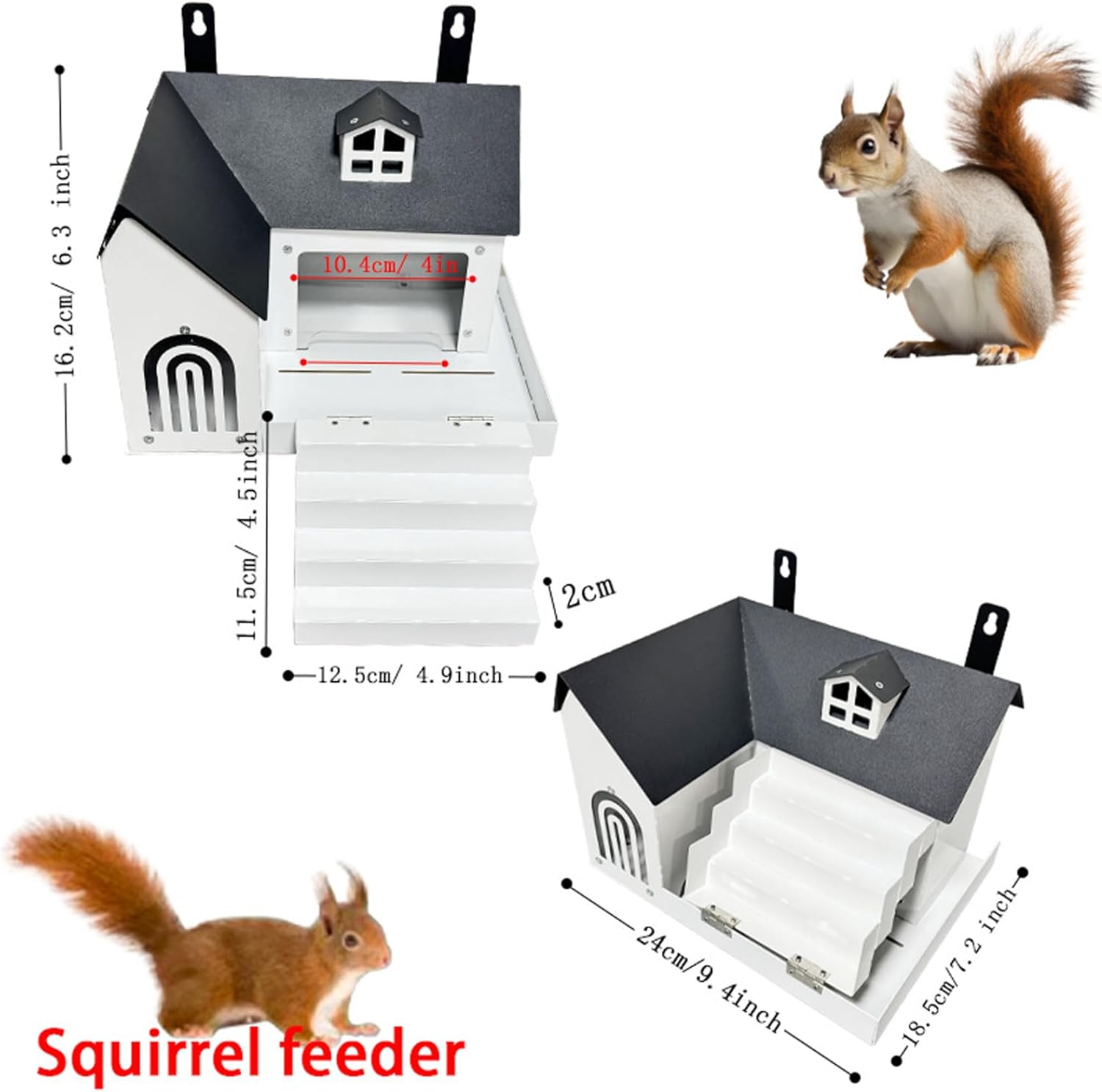 Description: This iron squirrel house combines stable outdoor protection with functional design to create an ideal nesting and feeding environment for backyard squirrels. Its sturdy iron construction withstands various weather conditions, ensuring long-term use in gardens and outdoor spaces. The clear window feature provides an unobstructed view to observe squirrel activity effortlessly, fostering a closer connection with nature without intrusion. Spacious dimensions of 9.4×7.3×6.4 inches and an included entry step allow squirrels comfortable access and promote natural behavior. Easy to install, this squirrel nesting box fits perfectly in outdoor settings, blending with garden aesthetics while supporting local wildlife by providing both shelter and food in one multifunctional unit. Designed with practical durability and wildlife-friendly features, this squirrel feeder enhances your outdoor space and invites frequent squirrel visits, making it an excellent addition for nature enthusiasts and garden lovers. Features:. -Color: White. -Material: Iron. -Size: 24×18.5×16.2 cm / 9.4×7.3×6.4 inch. Note:Manual measurement, please allow slight errors on size.The colors may exist slight difference due to different screens. Package Including 1 * Squirrel Feeder