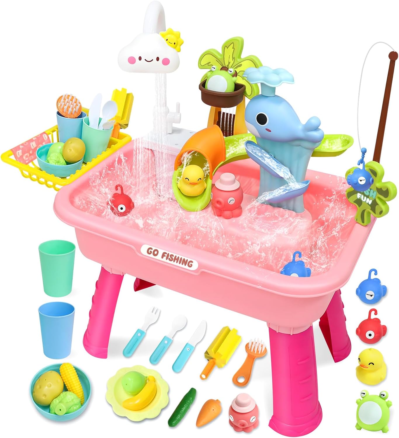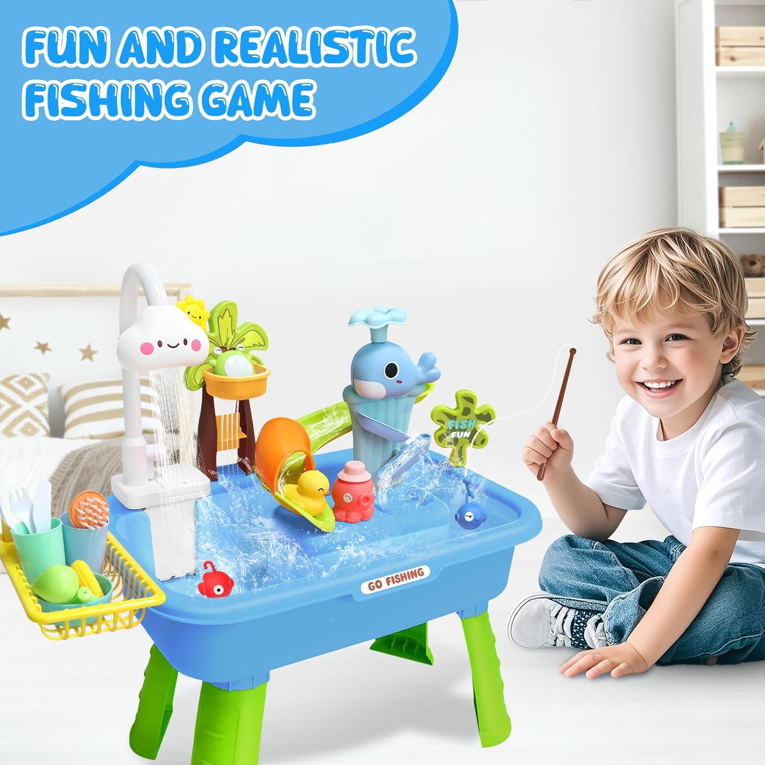 Water Play Table for Toddlers 1-3 with Play Sink & Electric Faucet, Kids Outdoor Water Table with Fishing Game, Summer Water Tables for Toddlers 1-3 Years