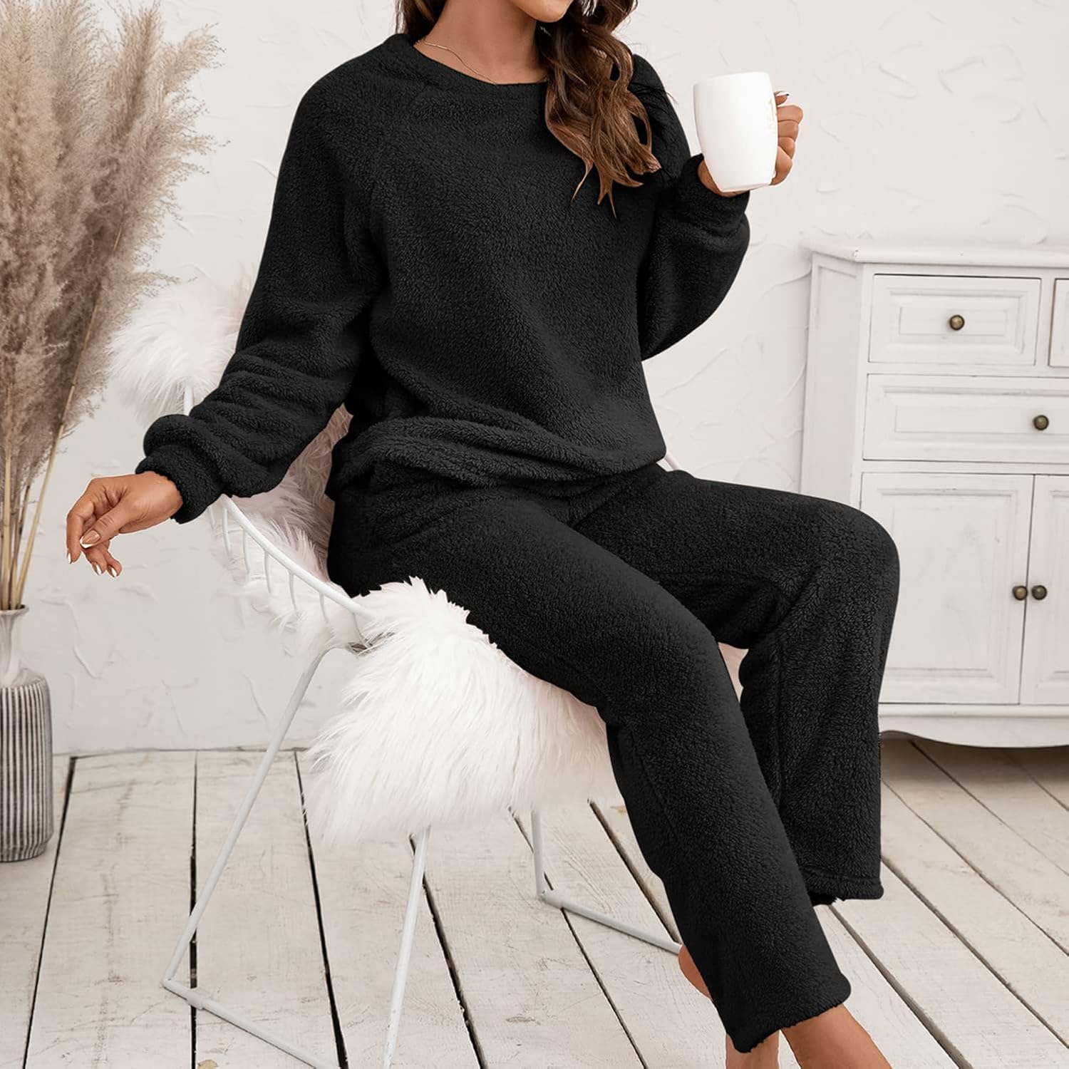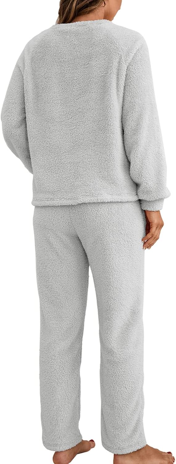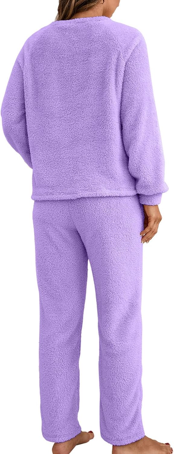 Homgro Women's Long Sleeve Pajama Set 2 Piece Sherpa Fleece Boat Neck Pullover Shirt and Pants Set Outfit Fall Pjs Spring Winter Warm Lounge Set Soft Loungewear Cozy Sleepwear