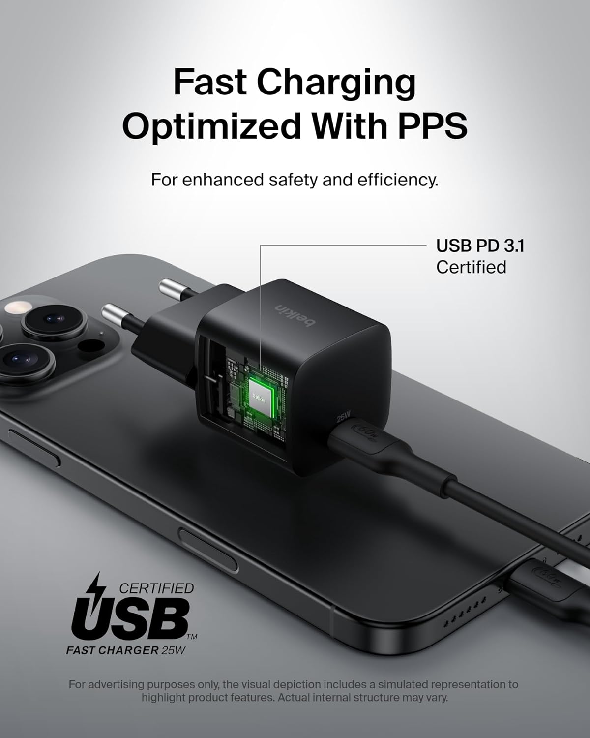 Charge your iPhone or Samsung smartphone from 0-50% in 30 min. * with our safe and powerful 25W wall charger with PPS. Integrated USB-C Power Delivery 3.0 and PPS technology ensure that the connected device is optimally charged, with the best charging voltage. For example, an iPhone 16 Pro Max with up to 25 W and a Galaxy S25 with up to 25 W can be charged safely and quickly. This universal wall charger is compact and is ideal for use in the home, office and travel. * USB-C PD technology charges an iPhone 16 Pro from 0% to 50% in 30 min. or a Samsung Galaxy S24 from 0% to 50% in 28 min. when using a USB-C / USB-C cable (not included). Charging time depends on environmental factors; actual results vary. ** Product housing at least 72% made of plastic recycled after consumer use. Belkin is the market leader in technical accessories and has been bringing innovative high-quality tech solutions to the market for 40 years. Specifications: Compatibility: Apple iPhone 16 Pro Max, iPhone 16 Pro, iPhone 16 Plus, iPhone 16, iPhone 15 Pro Max, iPhone 15 Pro, iPhone 15 Plus, iPhone 15, iPhone 14 Pro Max, iPhone 14 Pro, iPhone 14 Plus, iPhone 14, iPhone 13 Pro Max, iPhone 13 Pro, iPhone 13, iPhone 13 Mini, iPhone 12 Pro Max, iPhone 12 Pro, iPhone 12, iPhone 12 Mini, Samsung Galaxy S23, Galaxy S23+, Galaxy S23 Ultra, Galaxy S24, Galaxy S24+, Galaxy S24 Ultra, Galaxy S25, Galaxy S25+, Galaxy S25 Ultra, Google Pixel 8, Pixel 9, Nintendo Switch, iPad Pro 12.9" (5th Gen. ), iPad Pro 11" (3rd gen. ), iPad Air (5th gen). ), iPad (10th gene. ), iPad mini (6th gen.) Dimensions: 30mm x 30mm x 36mm Material: Housing 75% PCR material, 100% plastic-free packaging Input values: 100-240V~50/60Hz, 0.65A USB-C output: (PDO) 5V/3A, 9V/2.77A, (PP5S) -11 V/2.25 A (25 W max.) 2-Year Limited Warranty Connected Equipment Warranty up to €2000 Package Contents: BoostCharge USB-C Wall Charger (25W)