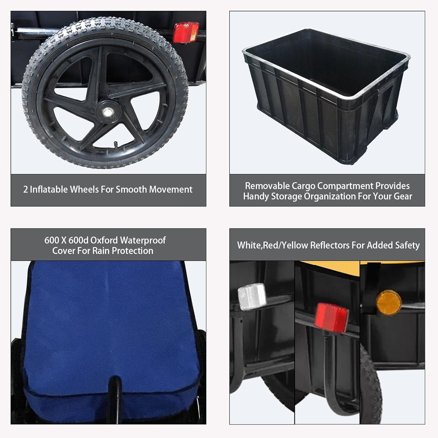 Our bicycle trailer is a good helper for family travel. It is a multi-purpose small trailer, which can be used for shopping, camping, grocery shopping, setting up stalls, moving houses, etc. It can make the handling of large and heavy objects very easy. Metal frame with anti-rust powder coating is and provide sturdy construction. SPECIFICATION Material type: Steel Frame material: Alloy Steel Trailer Size: 150x90x59cm/59x35.4x23.2inch Cargo Area Size: 64x48x31cm/25.1x18.8x12.2inch Weight Capacity: 50kg/110.23lbs Weight: 10kg/22.04lbs Package Included: 1 x Bike Trailer cargo (Included components)