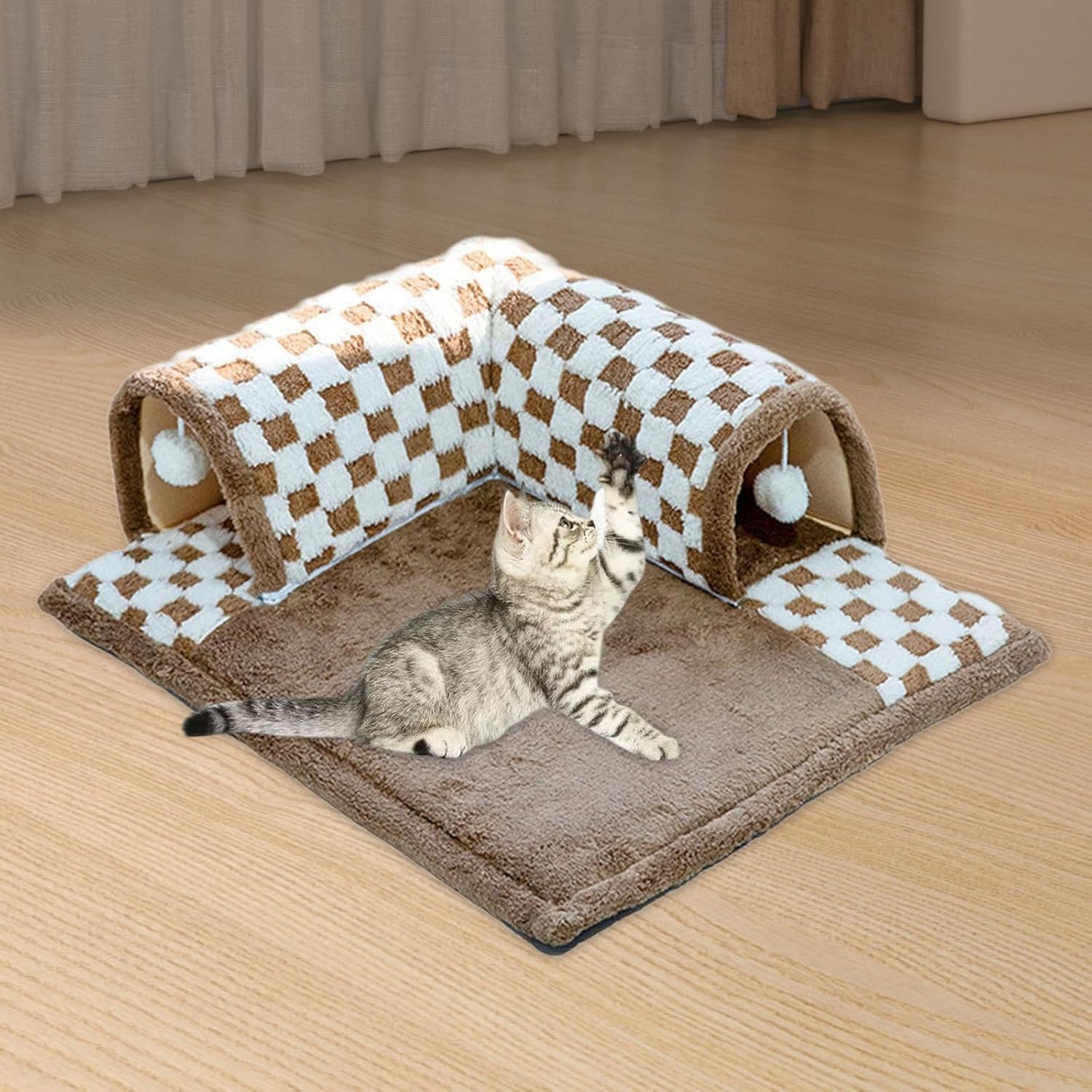 Description: - 【TUNNEL PLAYING】: A cat tunnel with nonslip bottom gives your ways to provide hours of exercise, self amusement - 【PREMIUM MATERIAL】: The kitten tunnel with playing ball is made of cloth, velvet, 20D sponge material, ,soft, comfortable. - 【DESIGN】: 2 in 1 design, Cat Tunnel Bed can be used as a cat bed or hiding place. - 【FEATURE】: Curious Pets Are attracted to interesting tunnels, offer the most interactive fun, and truly a great way to encourage daily exercise, and keep active. - 【WIDE APPLICATION】: Cat Tunnel Toy Tubes with Removable Mat is suitable for cats, kittens, ferrets, hedgehogs, chinchillas, small animals, etc.Size Chart:M: 48cmx48cm/18.90inx18.90in; for pet below 2kg.L: 66cmx60cm/23.62inx23.62in; for pet below 10kg.Package Includes:1 Cat TunnelNote:Please allow slightly errors due to manual measurement and different monitors.