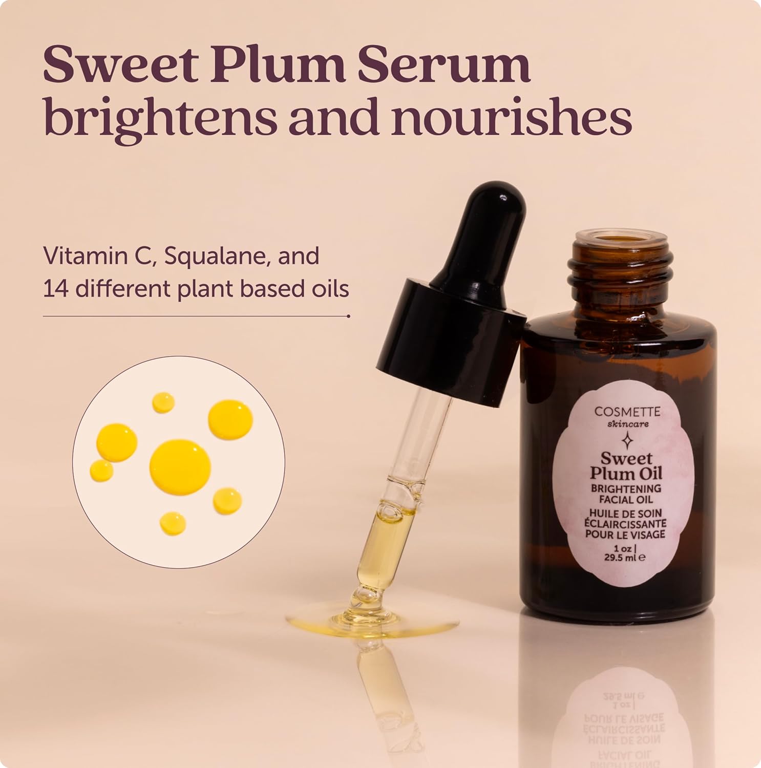 • (1) Sweet Plum Oil: Rich in antioxidants and essential fatty acids, our Sweet Plum Oil helps to replenish skin's natural barrier, promoting a healthy, luminous glow while supporting an even tone.