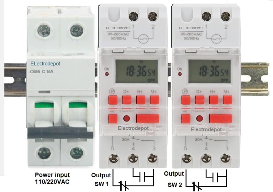 Programmable Dual timer ( Two separate timers ) 7 Day 24H Time Clock Universal Power Operation 110V, 120V, 208V, 220V, 240V Ready to mount inside panel or Electric enclosure. Supplied: One 2 Pole Circuit Breaker Two Programmable Timer One Din Rail 7 Day, 24 Hour Timer Manual - Auto, Override 3 Year Battery backup, 16 time schedules On/Off Operation: 16 on and 8 off (manual/auto) Display: LCD Power: 4.5VA(max) Operating Temperature: -10℃ to 55 ℃ Output Relay SPDT Rated 30Amp AC1, 16Amp AC3