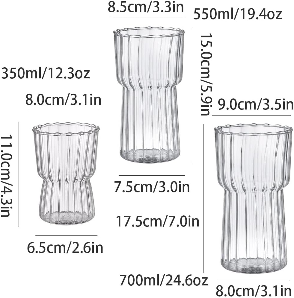 Suitable for any hot and iced drinks, including cocktails, hot drinks, iced drinks, milk, iced coffee, smoothies, beer and more.Product Name: Glass cupProduct Color: TransparentProduct Material: GlassProduct Capacity:350ml/12.3oz,550ml/19.4oz,700ml/24.6ozProduct Size:8.0 x6.5 x11.0cm/3.1 x2.6 x4.3in8.5 x7.5 x15.0cm/3.3 x3.0 x5.9in9.0 x8.0 x17.5cm/3.5 x3.1 x7.0inInstallation Method: CountertopPacking List:Glass cup(excluding other exhibits)Note: This product does not contain any liquidKind Tips:1.Due to the difference of light and monitor, the color of the picture may be slightly different from the real thing, please refer to the real thing2.The size is measured by hand, if there is a slight error, please refer to the actual product receivedGreat gift! Our glasses are well made and perfect for birthdays, housewarming gifts, tea sets, home bar accessories and Christmas gifts.