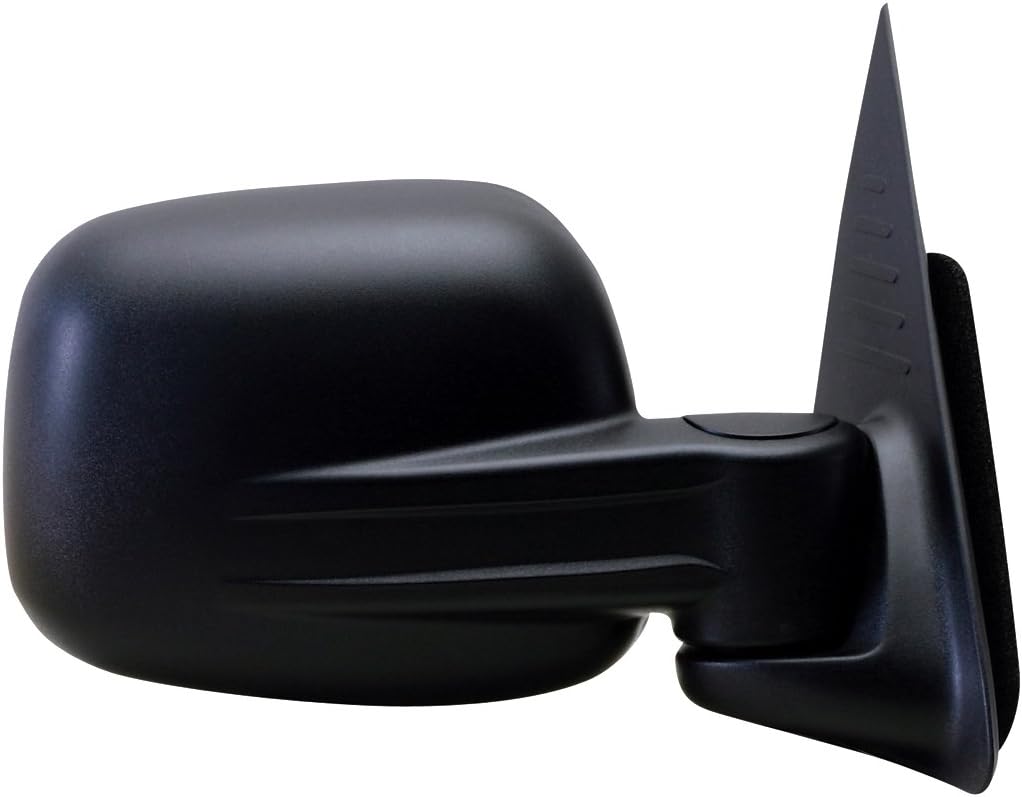 Driver Side Mirror for Jeep Liberty. Black. Foldaway. Manual. Mirror glass adjusted manually. Flat Lens. Mirror glass does not have heating capabilities. Manual folding for additional clearance. Mirror has no turn signal. Housing finish is Textured Black.