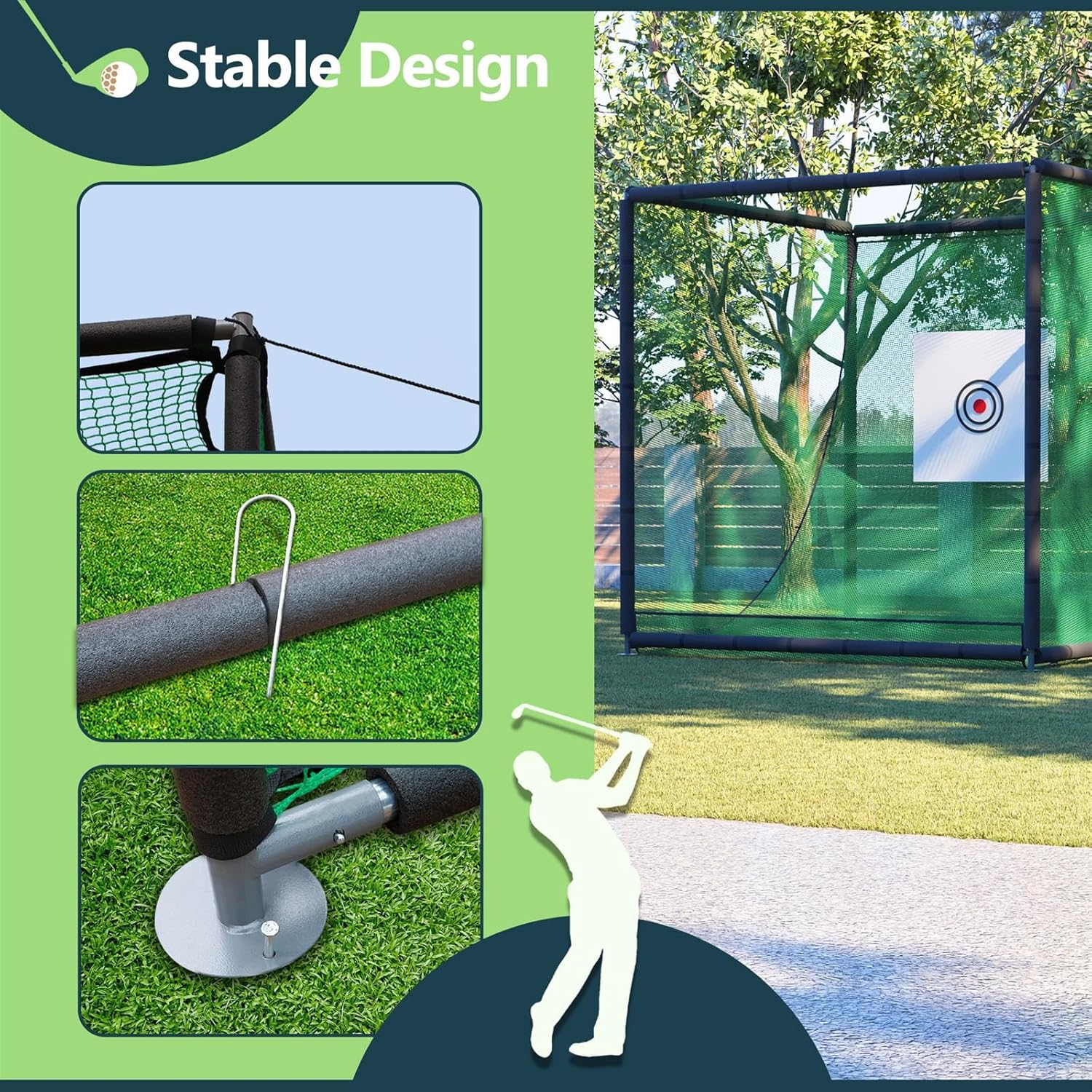 Transform your golf game with this premium 10x10x10 ft practice net cage, perfect for dedicated practice sessions right in your backyard. The robust metal frame construction provides exceptional stability, while the innovative double-layer netting system ensures durability and reliable ball capture. A generous 59-inch target cloth helps sharpen your accuracy, making every practice session more productive. This versatile training solution accommodates all skill levels and various shot types - from powerful drives to precise chip shots. The black-finished cage assembles in under 30 minutes without special tools, offering year-round training possibilities in your backyard, garage, or indoor space. Practice at your own pace and convenience without the need for frequent trips to the driving range. The thoughtfully designed frame measures 118.11 inches in each dimension when assembled, creating an ideal practice environment. Ball collection is streamlined for continuous practice, while the sturdy iron construction withstands repeated powerful shots. Whether you're working on your swing mechanics or fine-tuning your accuracy, this practice net provides the perfect training solution for serious golfers.