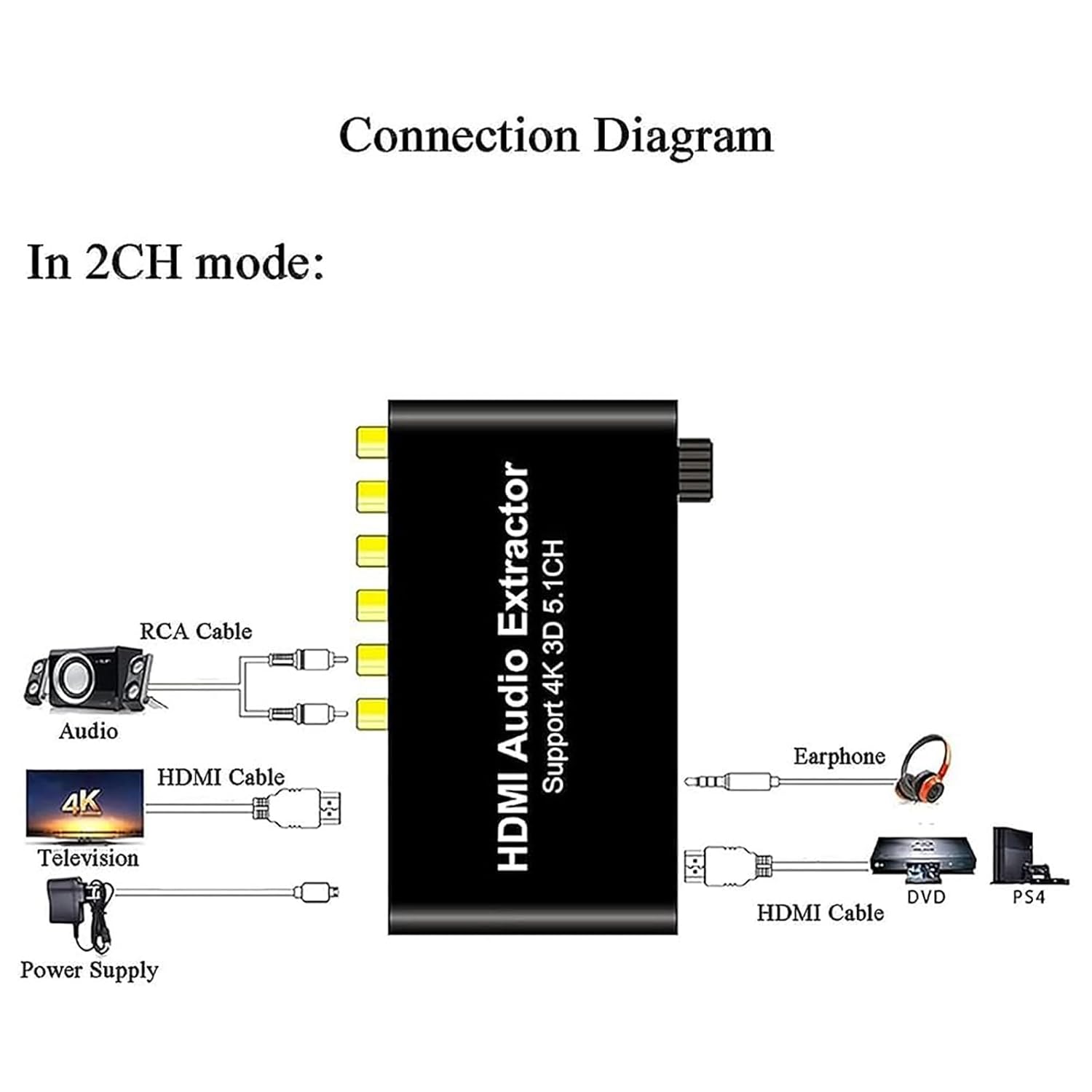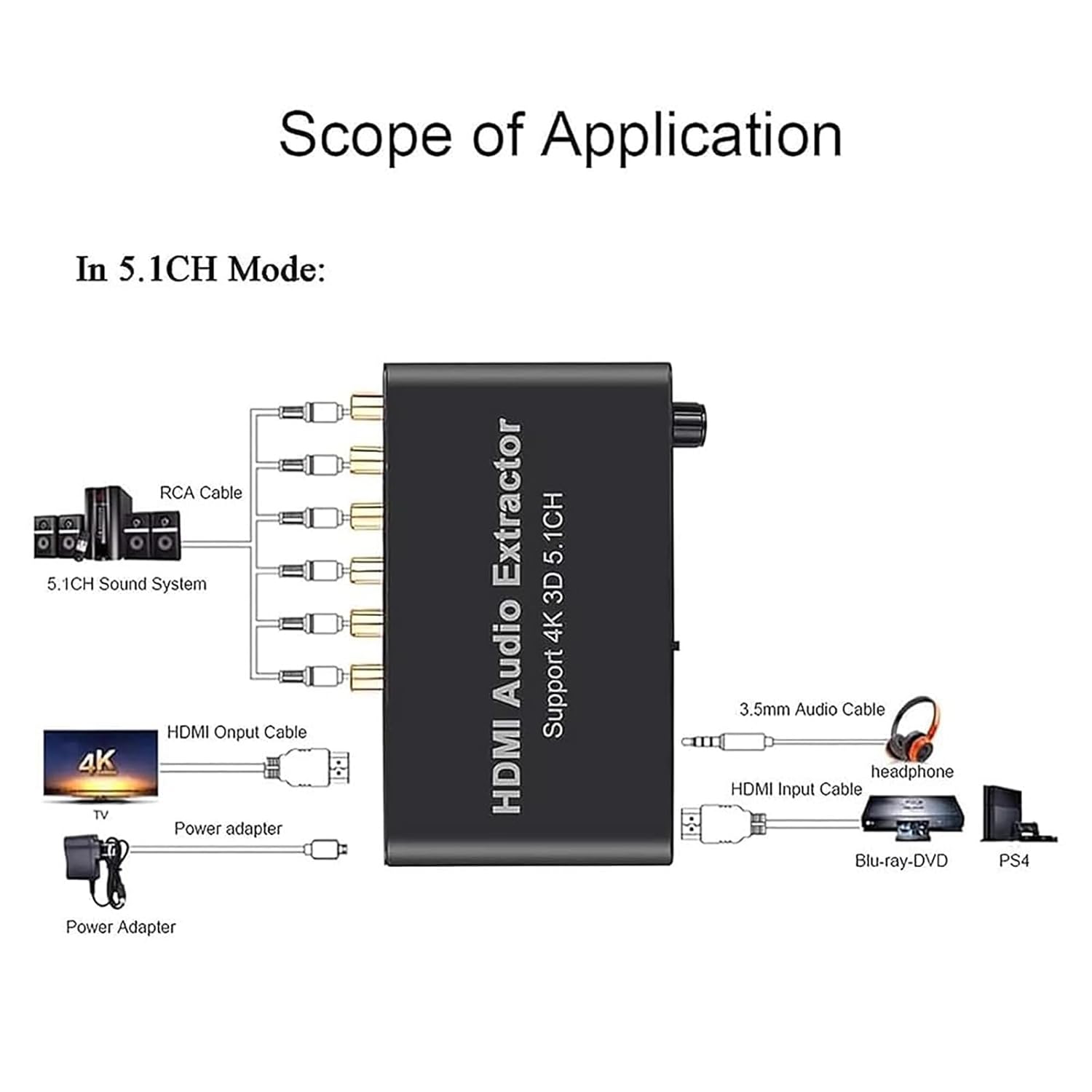 Product Description: -Build-in high performance RTOS operating system and audio decoder chip; support DTS/AC-3. -Super fast start time about 3 seconds. -Input: HDMI, Output:HDMI;SW,CEN,SR,SL,FR,FL; 3.5mm Headphone Port -HDMI Input Resolution: Up to 3840x2160@30Hz;4096x2160@30Hz. -Auto decode AC-3/DTS (LPCM/PCM/RAW) input signal without any action Specification: HDMIResolution:2160p@30Hz/ 1080p@50/60Hz/1080i/720p/1576i/480p/480i SupportVideoColorFormat:24bits/deep color 30bit,36bit AudioOutput:2CH/5.1CH Analog Audio MaxBandwidth:340MHz MaxBaudRate:10.2Gbps Input/ Output TMDS signal:0.5-1.5Volts p-p(TTL) Input/ Output DDC signal:5Volts p-p(TTL) SupportAudioFormat:MP3,AC3,DTS,WAV,WMA,AAC,ALAC,FLAC,APE,OGG,M4A Signal Noise Ratio:120db Stereo Isolation:80db(1KHZ) Channel Unbalance:0db Sampling Rate:32~192 KHz Bit Rate:16~24 Bit Response Frequency:20Hz~20KHz+/-0.7db THD:20Hz~20KHz 0.25-0.065% THD+N:1KHz 0.15% Max Power Current:420mA Power adapter format: input:AC(50/60Hz)100V-240V, Output:DC5V/2A
