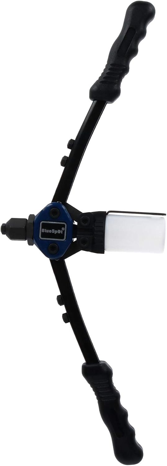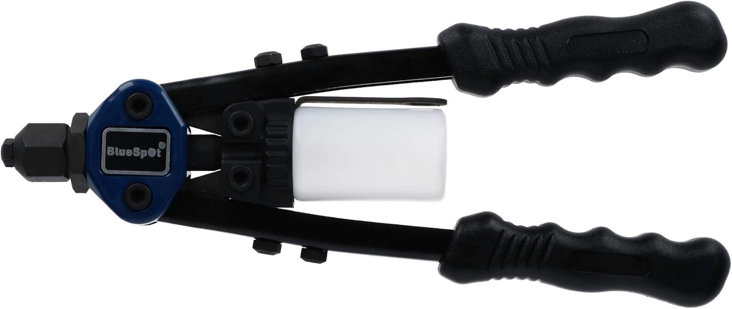 Professional riveter for commercial or occasional use Pop riveter / hand riveter tool Suitable for rivets from 2.4mm to 4.8mm Comes with a unique hidden spring design of the rivet unit allows the handles to spring back to its original position automatically Suitable for use with steel, aluminium or stainless steel rivets Stem collection tank helps avoid unnecessary clean up and to collect used mandrels Simply unscrew the pot to tip away the spare mandrels 3 pc alloy steel jaw provides increased rivet grip All the different size nozzles are stored in the handle to prevent them from being lost or misplaced Suitable for rivets 2.4mm / 3.2mm / 4.0mm and 4.8mm Rubber ergonomic handles for comfort and grip when using Total length of the riveter 280mm