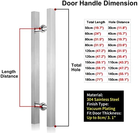 Introducing our premium 304 stainless steel door handles, designed to elevate your home with both style and functionality. Available in sleek colors including black, white, and matte black, these handles not only enhance the aesthetic of any door but also provide durability and a comfortable grip. Crafted with a plating coating, our handles resist wear and tear, ensuring they maintain their polished appearance over time. Each handle is thoughtfully designed to fit door panels with a thickness of up to 8cm (3.1 inches), making them versatile for a variety of installations, whether in your living room, kitchen, or office. Our product comes in multiple dimensions to suit your needs: 50cm x 30cm, 60cm x 40cm, 80cm x 50cm, 80cm x 60cm, 120cm x 80cm, 120cm x 90cm, 150cm x 110cm, 150cm x 120cm, 180cm x 140cm, and 180cm x 150cm. This range ensures you find the perfect size for your specific doors. Included in the package are all the necessary installation tools: a pair of handles, a screwdriver, a hex wrench, hexagon screws, long screws, slip silicone mats, and fixed screws. This complete set simplifies the installation process, allowing you to upgrade your doors with ease. Before placing your order, please refer to the size measurement chart and allow for a slight variation of 1-3 mm due to manual measurement. Enhance your living space with our stylish and durable door handles, which combine practicality and modern design, making them the perfect choice for any homeowner.