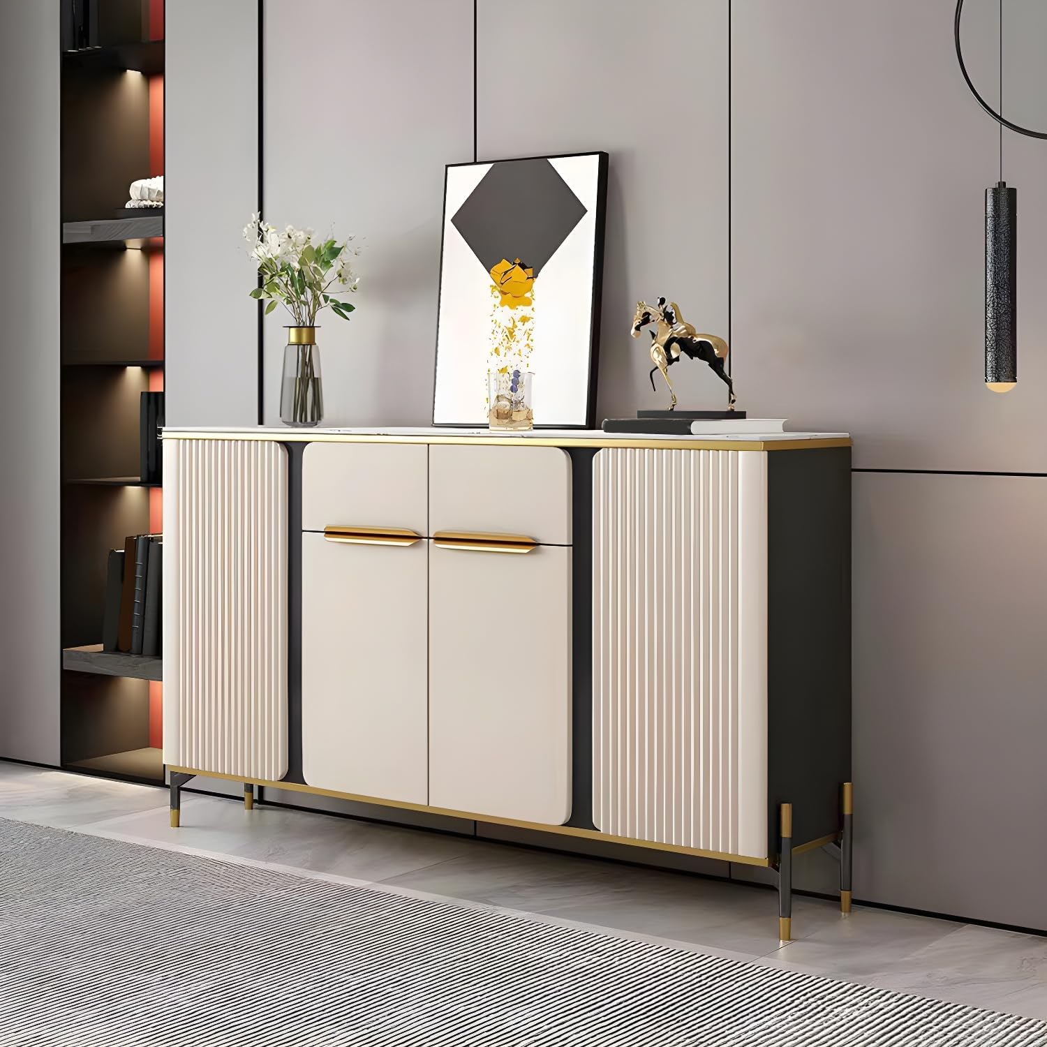 ✦✦Specifications ✦Information Category: Sideboard Usage: Living Room, Bedroom, Hotel, Office, Kitchen, Coffee Shop, Restaurant..... Style: Modern / Creative / Simple ✦Dimensions Entrance Cabine: 55"L x 14"W x 37"H ✦What's Included Number of Items Included: 1 Piece Assembly Tool: Yes Instruction Manual: Yes ✦Material Material: Wood + Slate + Metal ✦Features Outdoor Use: No Drawers Included: Drawers Included Wheels Included: Casters Not Included Cabinets Included: Cabinet Included Number of Doors: 4 Shelves Included: Shelves Included Adjustable Shelves: Adjustable Wine Rack: Wine Rack Not Included Welcome to visit our store and buy our special designed and good quality products. If you have any questions about our products and service, please feel free to contact and we will always be here to assist.