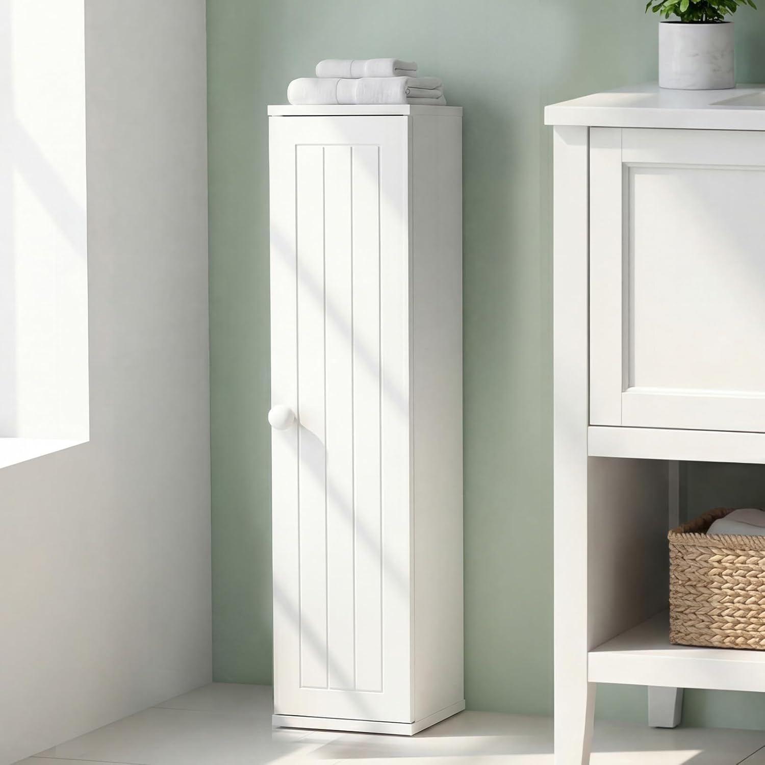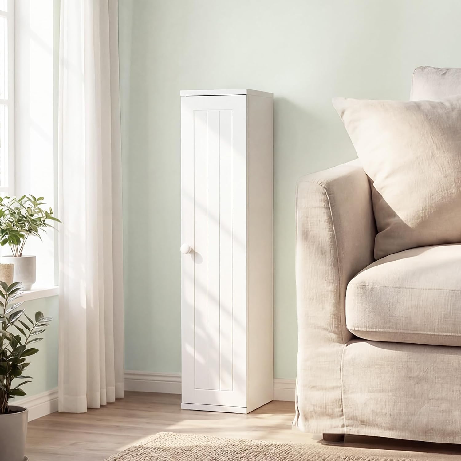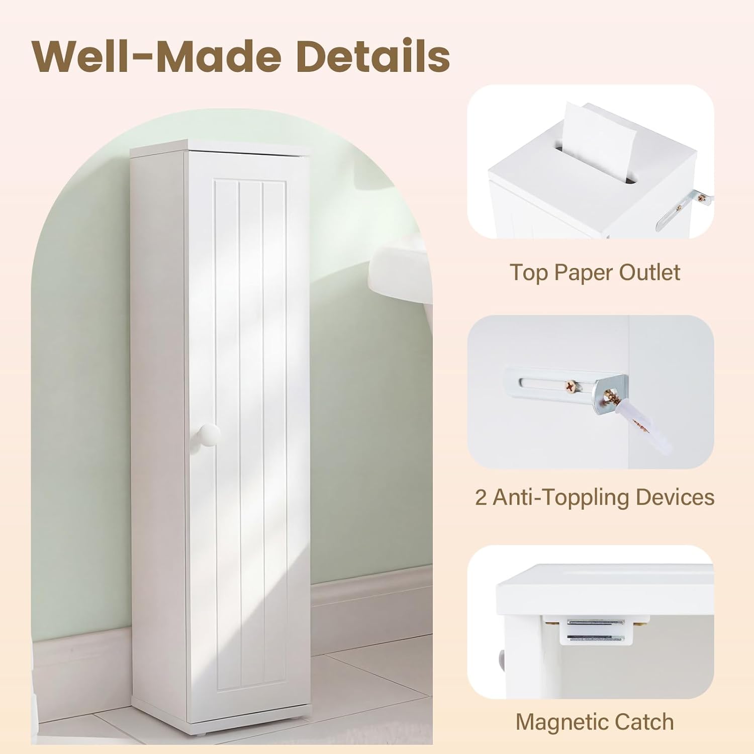 Description:The vertical design of our compact toilet paper holder is suitable for small spaces. If you now live in a small apartment or want to exchange the limited corners in your home in to a useful one, you can consider to choose us. Besides, featuring 4 detachable shelves, this slim bathroom storage cabinet provides a large storage space, at the same time, the waterproof surface can withstand dank environment, ideal for bathroom to use. The inner compartment size is suitable for most toilet rolls, while the top slot allows you to draw the tissue from which. Don’t worry about the installation, you can follow a step by step instruction and finish the assembly within a few minutes.Features:Constructed from high-quality P2 MDF material, this slim bathroom storage cabinet is very sturdy The shelves are detachable, which can be adjusted to different heights to suit your varying needsMeasures 6.5'' x 6.5'' x 27 (L x W x H), the vertical design is suitable for small spaces, translating the corner into a useful oneFeaturing 4 layers in total, this small bathroom storage cabinet offers a large storage space for bathroom essentialsThe inner compartment size is suitable for most toilet rolls, while the top slot allows you to draw the tissue Covered by waterproof paint, this toilet paper holder free standing can withstand dank environment in the bathroomThe installation is easy, for you can follow a step by step instruction and finish the assembly within a few minutesSpecification:Color: WhiteMaterial: MDFOverall Dimension: 6.5” x 6.5” x 27” (L x W x H)Net Weight: 6.5 lbsPackage Includes:1 x Tissue Cabinet1 x Instruction