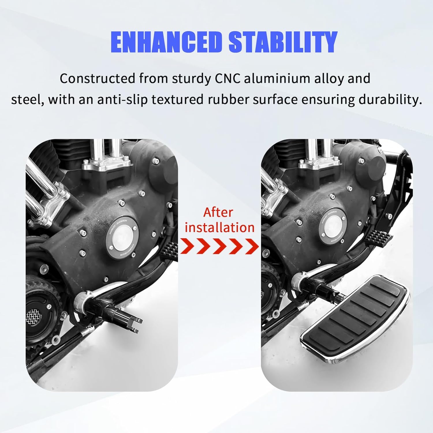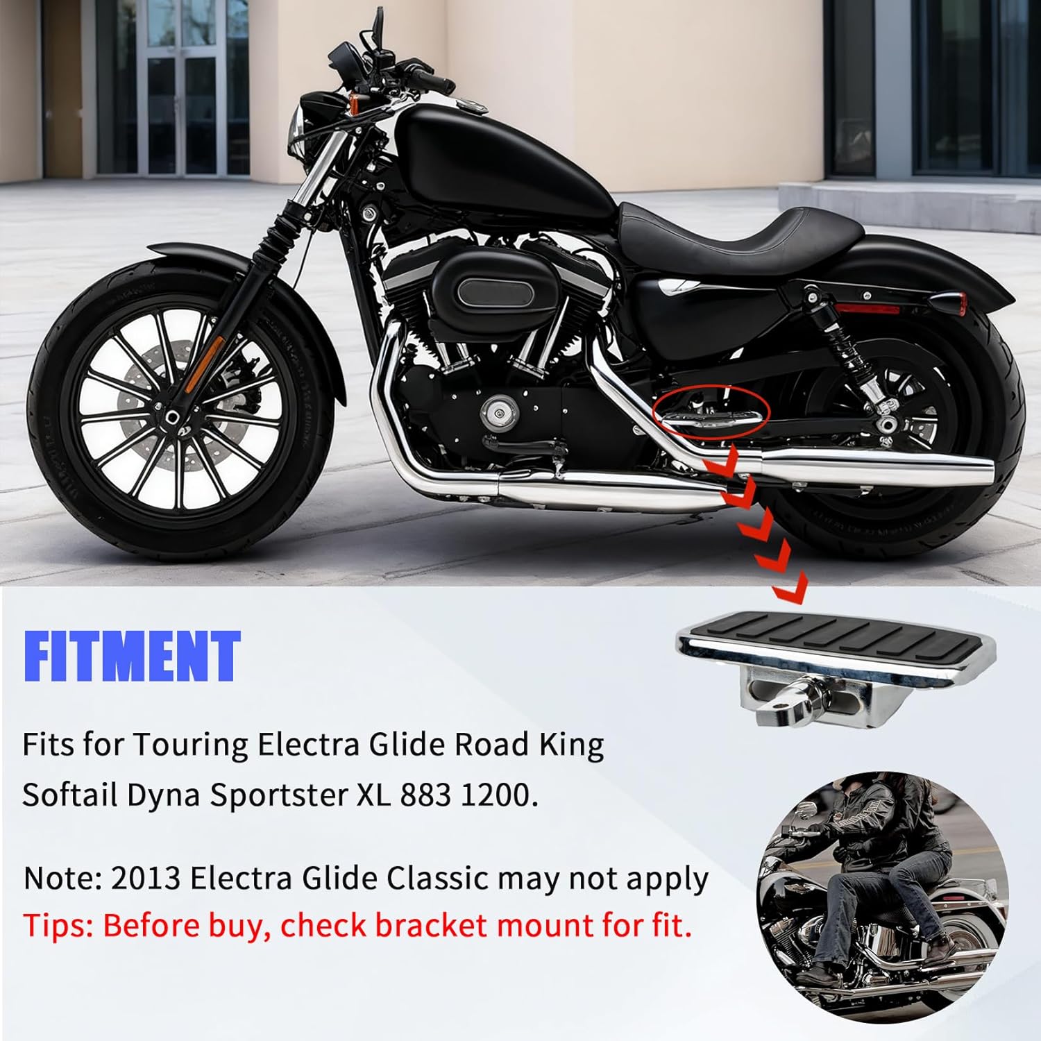 Key Features & Benefits: - Superior Comfort: The wide, textured surface reduces foot fatigue, allowing you to enjoy extended journeys without discomfort. - Enhanced Control: Improved grip and a secure footing give you greater confidence and control in all riding conditions. - Durable Construction: Made from robust materials with a premium chrome finish that resists rust, scratches, and fading. Notes: 1.Please check carefully whether your model is included in the fitment before purchasing. 2.The product does not contain installation instructions. If you have any questions about that, we kindly recommend you go to the nearby mechanic to ask for professional instructions.