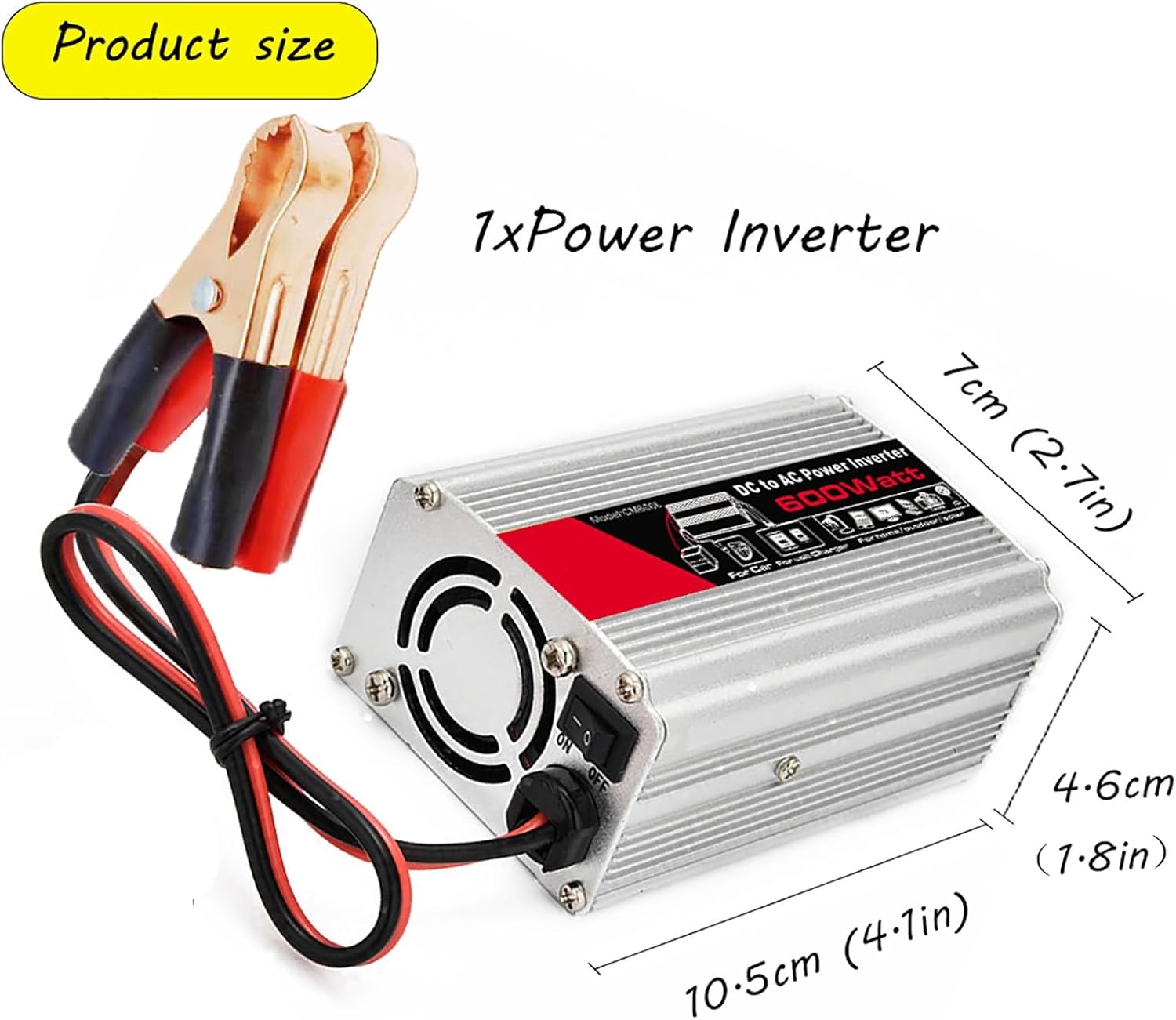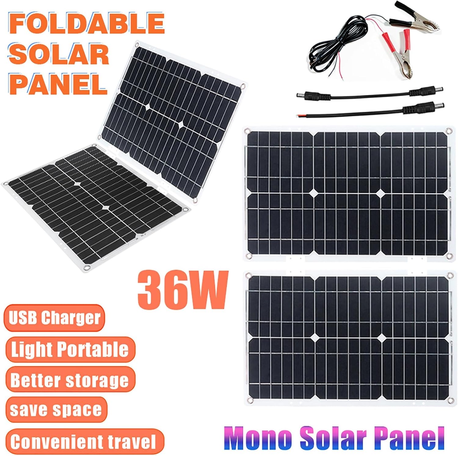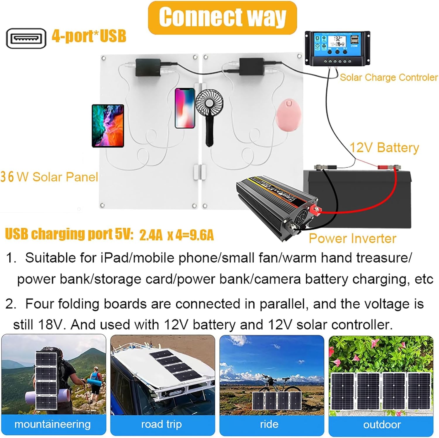 1. Solar Panel 36W:Power: 36W± 5%Dimensions: 560x420x3mmDC Input/Output: 18V/2.8A(36W)USB Output 1: 5V/2.4AUSB Output 2: 5V/2.4AWeight: 0.8kgPackaging Weight: 0.9kgPackaging Dimensions: 445x300x41mmType: Single Folding Solar PanelMaterial: Aluminum Substrate + High-efficiency Chip + PET2.30A 12V 24V Automatic Solar Charge Controller PWM with LCD Controller and Dual USBCharging Current: 30AProduct Dimensions: 134x70x33mmPackaging Dimensions: 136x80x39mmVoltage: DC 12V / 24V Automatic Intelligent ConversionDisplay: LCD Digital DisplayUSB Charger Port: Dual USB 5V 2.1AOperating temperature: -35~+60Maximum solar input: 12V battery, up to 23VFloat charge: 13.7V (default, adjustable)Discharge stop: 10.7V (default, adjustable)Discharge reconnection: 12.6V (default, adjustable)Charge reconnection: 13VLight on voltage: solar panel 8V (light delay)Light off voltage: solar panel 8V (light off delay)USB output: 2-way USB output, 5V/2.5A (max)3. Power inverter:Specifications:Model: CM-600LColor: SilverName: Car power inverter.Input voltage: DC 10.5V~15V.(When the battery voltage is below 10.5V, the inverter is under voltage protection, and when the battery voltage is above 15V, the inverter is under high voltage protection)Output voltage: AC 220VOutput frequency: 50HzPeak power: 600WRated power: 300WOutput waveform: modified sine waveProduct size: 105*70*46mmPackaging size 160x80x 50mmWeight: 0.4kgWhat size inverter do I need?The size you choose depends on the wattage (or ampere) you want to run (find the power consumption by referring to the specification plate on the appliance or tool). We recommend that you buy a larger model than you think you need (at least 10% to 20% more than the maximum load).