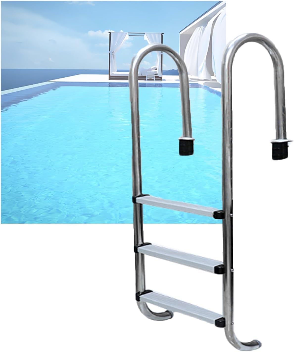 Are you tired of climbing up and down every time you get in and out of the pool? Our pool ladder is your solution. Made of stainless steel, it can hold even heavier adults steady. The humanized design makes getting in and out of the pool easy and comfortable, improving safety and stabilityFEATURES:1. Thickened 304 stainless steel, strong and stable, can be reused for a long time2. Ergonomic handrail curve, more stable and easy to grip3. The raised texture the pedal surface enhances grip and ensures safety4. Strong load-bearing capacity, not easy to deform or breakSPECIFICATIONS:Product Name: Swimming Pool Ladder/Stainless Steel Pool Ladder/Stainless Steel Pool Steps/Pool Pedal LadderColor: SilverMade Of: 304 Stainless SteelNumber Of Steps: 2/3 stepsSize: As shown in the pictureWall Thickness: 1mmPipe Diameter: 42mmApplicable Swimming Pool Height: 2-steps ladder applicable 0.8-1m/31.5-39.4in swimming pool3-steps ladder applicable 1-1.4m/39.4-55.2in swimming poolInstallation Method: Pre-embedded+Drilling requiredApplicable Places: Suitable for outdoor baths, indoor swimming pools, open-air baths, water parks and other placesPACKAGE INCLUDE: Swimming Pool Ladder x 1Other Installation Accessories x 1KIND TIPS: 1. This product only includes the swimming pool ladder and does not include other decorative props in the picture2. Due to manual measurement, there may be an error of 1-2 centimeters in the actual product. Please refer to the actual product3. Due to different computer monitors or lighting effects, the color of the actual object may be slightly different from the picture the details page. Please refer to the actual object