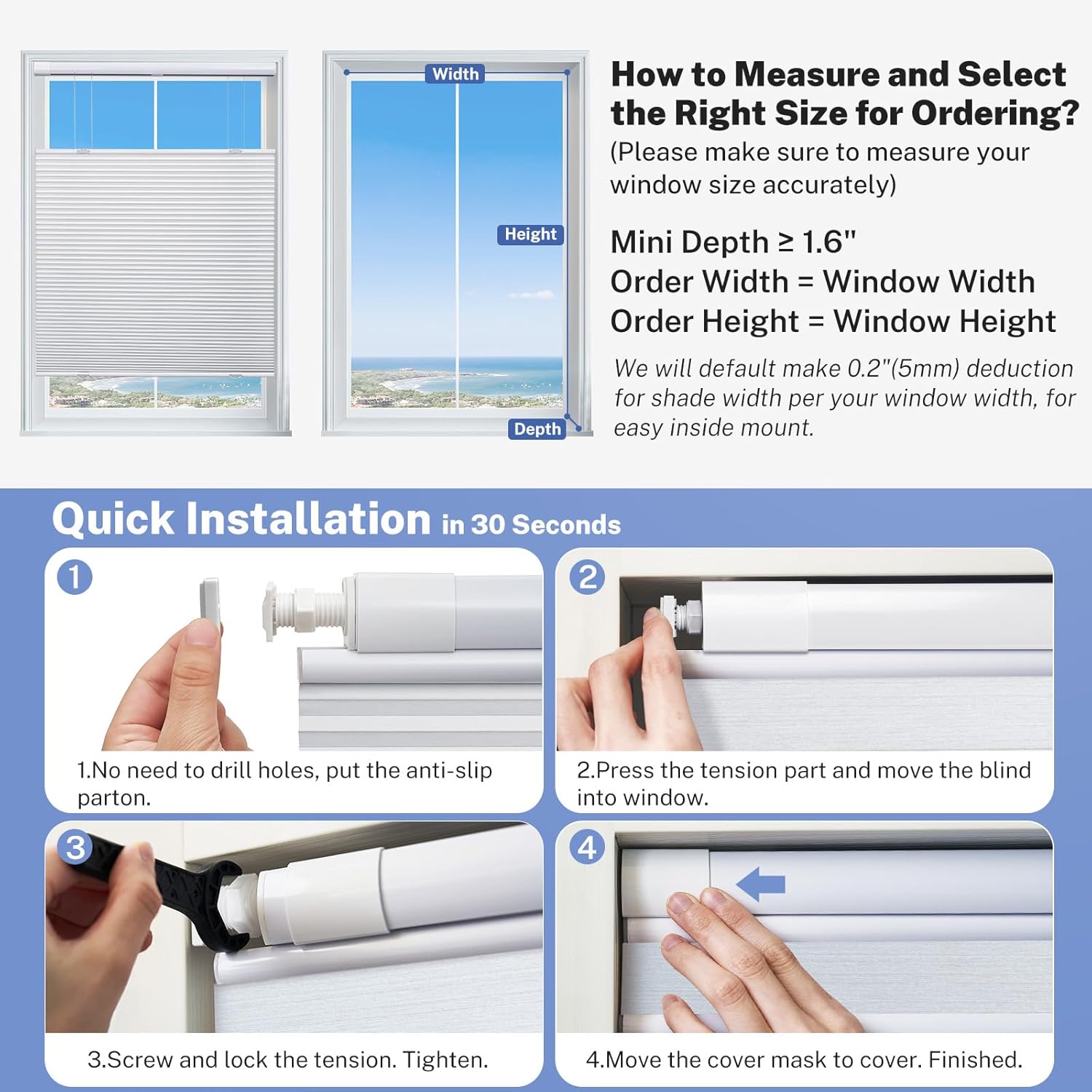 | Additional Features | Blackout, Cordless, Custom Sizes, No Tool No Drill, Top Down Bottom Up |