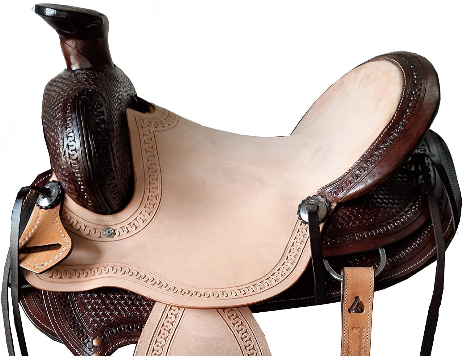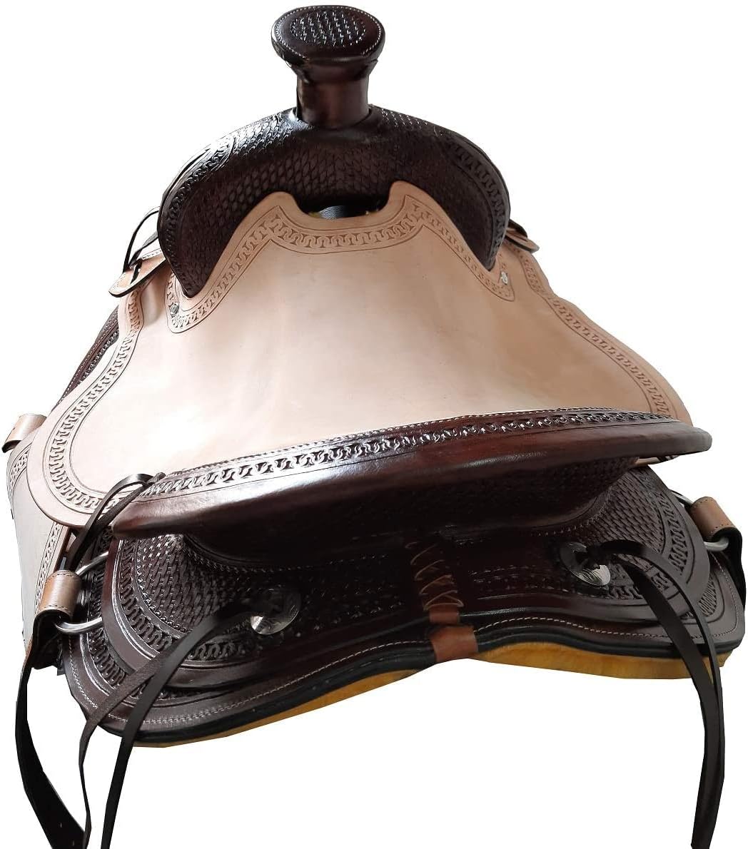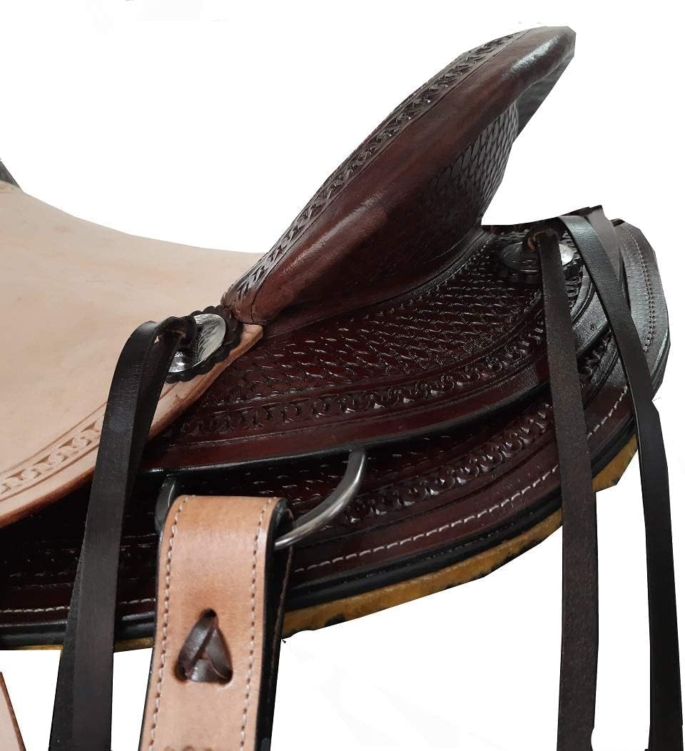 A saddle is an essential piece of equipment for horseback riding, providing both comfort and control for the rider. Crafted from high-quality materials like leather or synthetic fabrics, a well-designed saddle distributes the rider's weight evenly across the horse's back, preventing discomfort or injury. With its sturdy tree and padded panels, a saddle offers secure seating and leg positioning for optimal balance and communication with the horse. Whether you're a recreational ride Saddles are an essential piece of equipment for any equestrian, providing the crucial connection between rider and horse. Crafted with care and precision, a high-quality saddle offers comfort, support, and control for both the rider and the animal. Whether you're a seasoned competitor or a casual trail rider, finding the right saddle can make all the difference in your riding experience. With a wide range of styles and materials available, from classic English to rugged Western designs, there's a saddle to suit every discipline and preference. Invest in a well-made saddle, and you'll enjoy countless hours of enjoyable and secure riding adventures. *** Girth Cinch, Back Cinch, Saddle Pad, and Horse Bit NOT INCLUDED *** Our top selling leather colors are now available in this beautiful A-Fork wade tree roper! This wade tree roping saddle features a hand carved tooling that is designed on thick cowhide leather. The seat offers the perfect grip while roping cattle. The classic design of the saddle features shiny silver conchs and numerous ties for accessory attachments. . The wide pie horn is reinforced with a mule hide wrapping for extra stability and durability. The underside of the saddle is well-padded with fleece for maximum horse comfort. 100% Heavy Duty Cowhide Leather Hand Carved Tooling Seat Mule Hide Wrapped Horn Numerous Accessory Ties Shiny Silver Sun Conchs Adjustable Stirrups Adjustable Blevins Buckles Well-Padded Fleece Underside Wade Tree Design Wood Base Tree Wrapped In Fiberglass. If You require Wooden Tree Saddle in the same Model Kindly Drop a message. Saddle Specifications:- Color: As Per Picture. Pony Saddle Measurements:- Seat Size: 10 to 12 inches. Gullet: 5" FQHB . Skirt: 23 – 26” Horn: 2” x 5” wide. Horn: According to Picture. Swell: 6” Cantle: 3” Stirrups: 25 – 35 Weight: Approx. 24 lbs. Adult Saddle Measurements:- Seat: 14" to 18" inches Seat. Gullet: 7" FQHB . Skirt: 25 – 29” . Horn: 3” x 5” wide . Horn: According to Picture. Swell: 8” . Cantle: 4”. Stirrups: 28 – 38”. Weight: Approx. 28 lbs